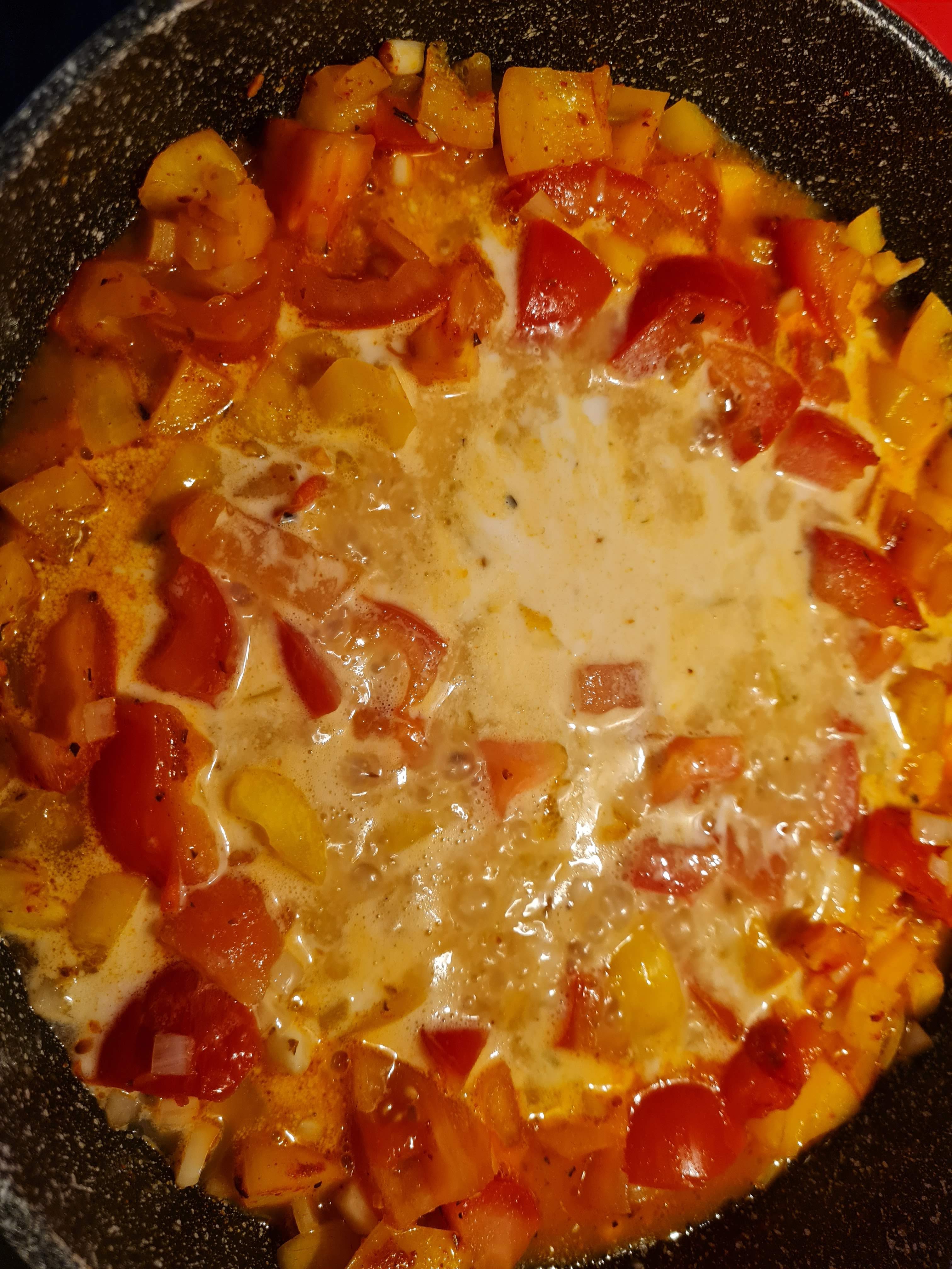 Сервирам го с ароматен басмати ориз и кремообразен сос от кокосово мляко с чушки и домати.
