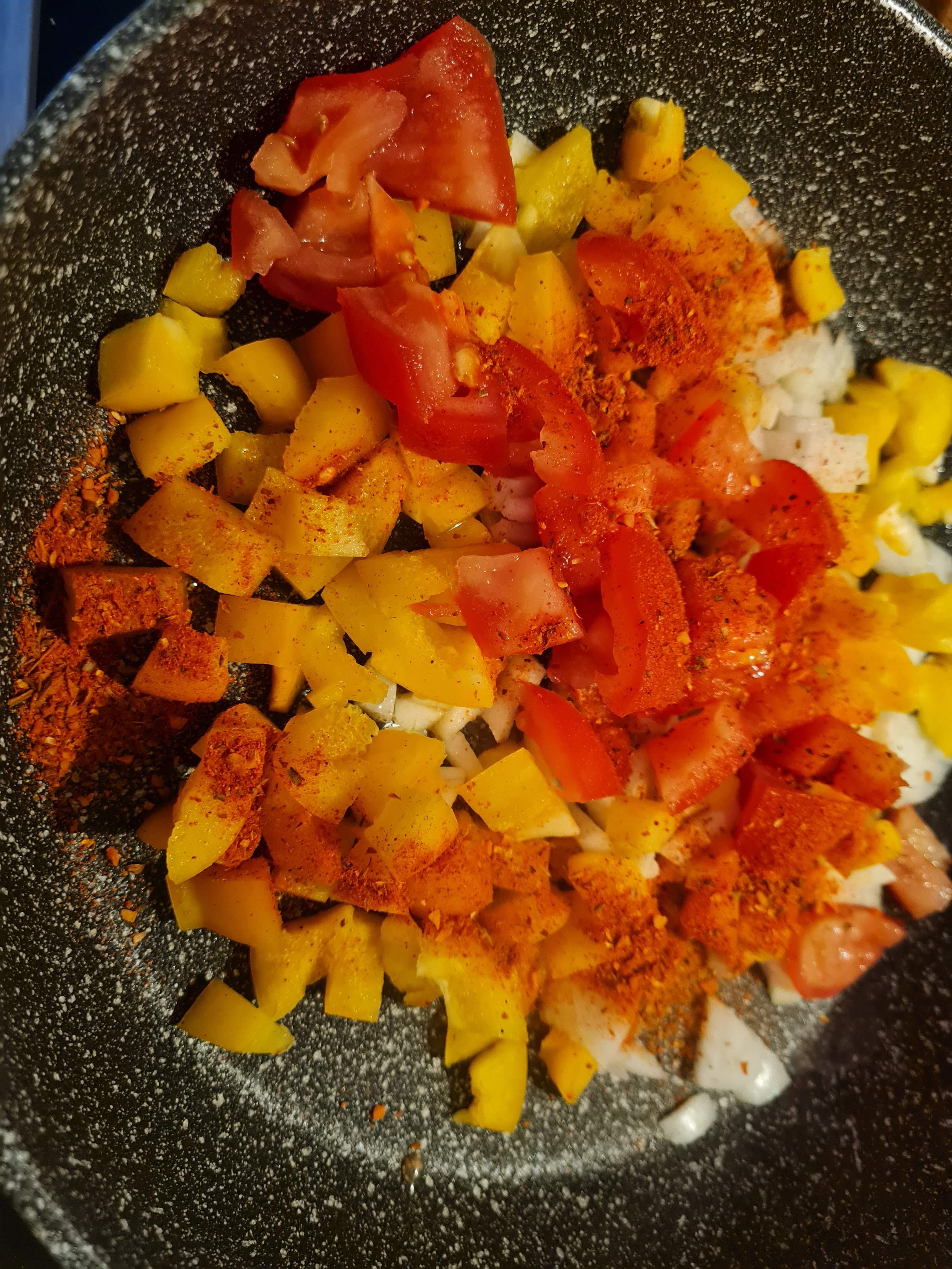 - В подходящ тиган загрявам олиото и добавям нарязания на кубчета лук, нарязания на ситно чесън, чушката почистена и нарязана на едри кубчета, както и доматите.
