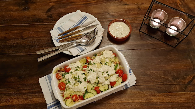 Всичко е точно така, само че първо запичаш месото с картофите и кашкавала, вадиш от фурната и тогава слагаш салатата с чесновия сос.