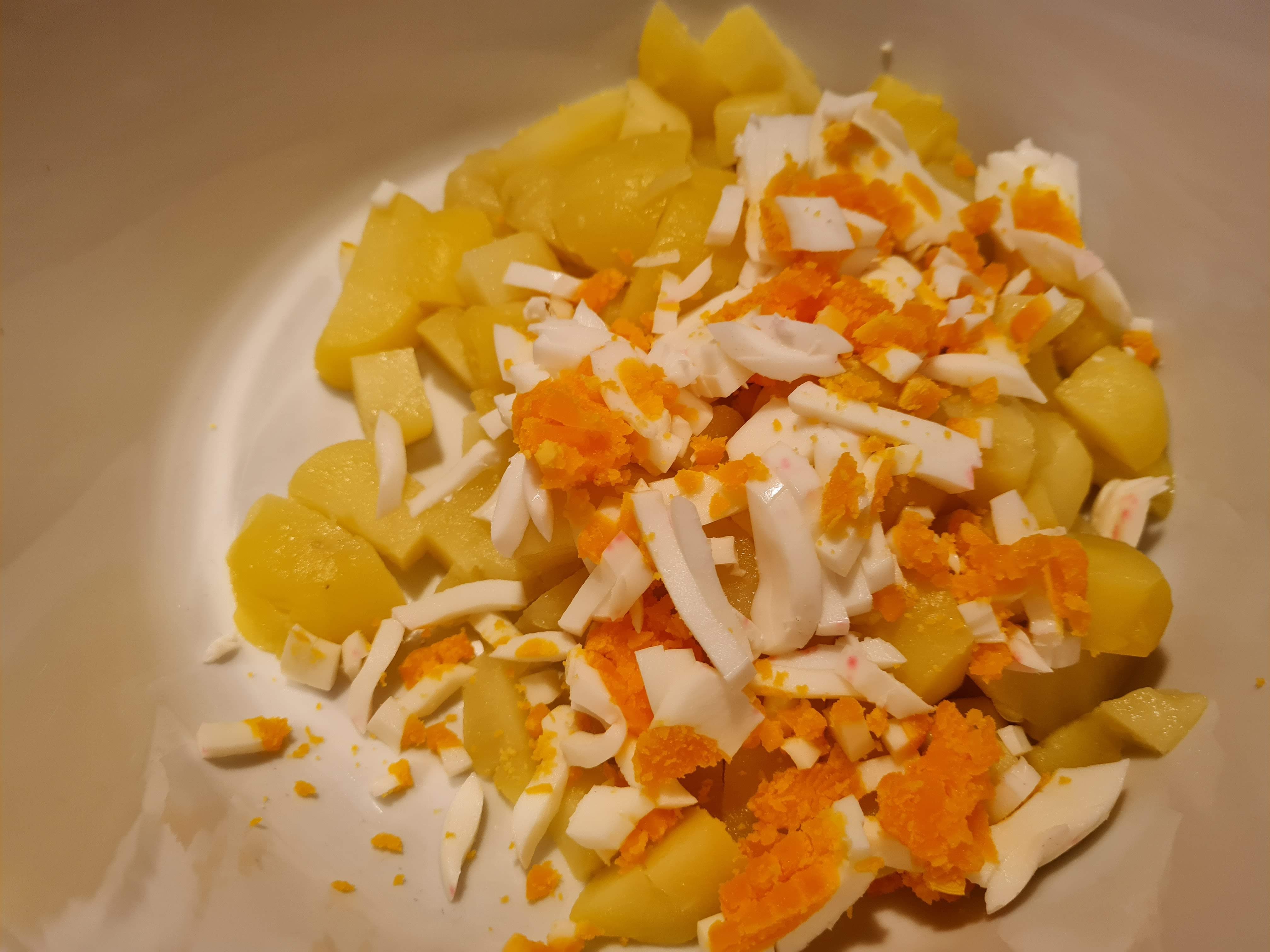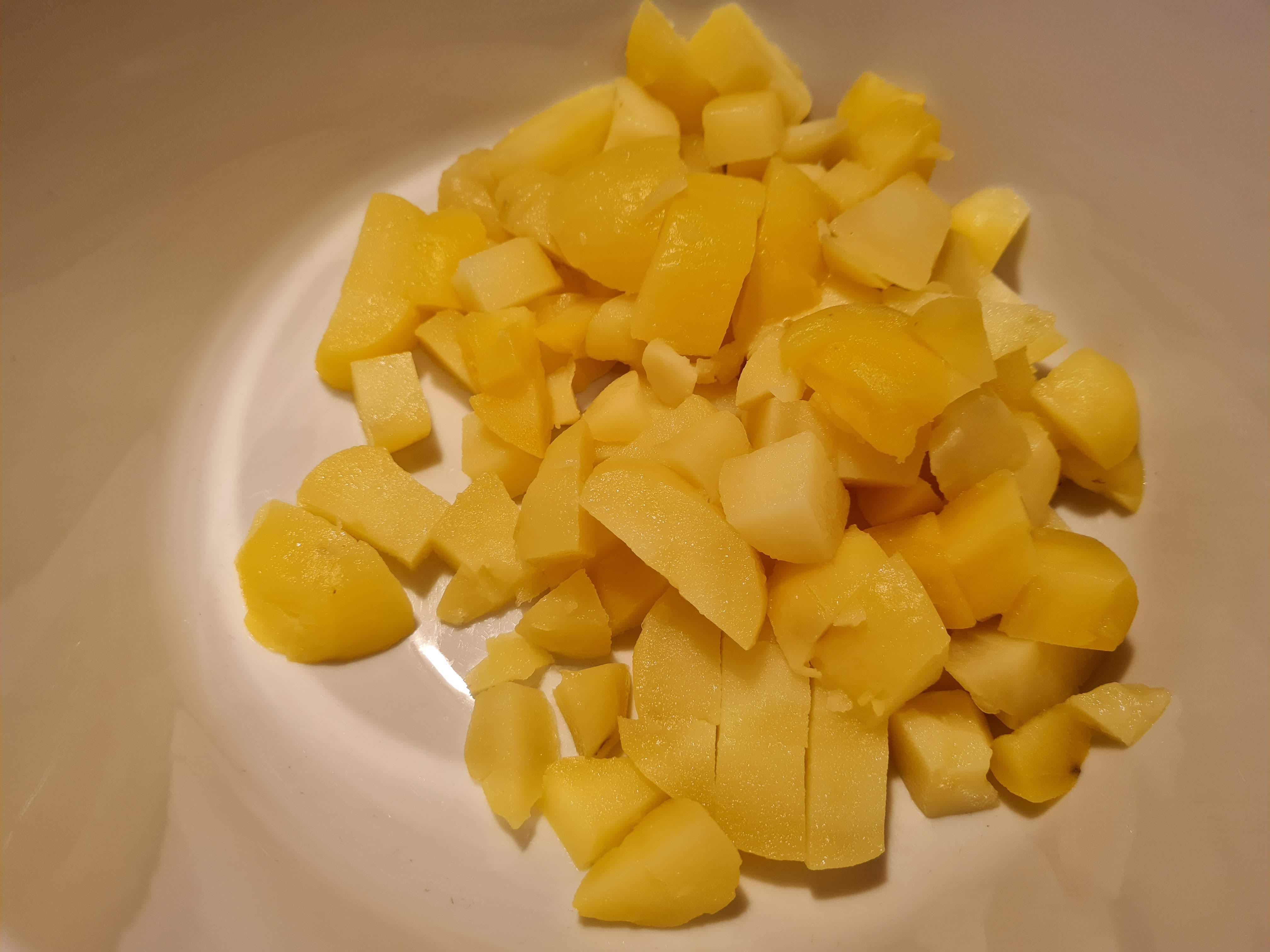 - Започвам с приготвянето на салатата като обелените картофи нарязвам на кубчета с размер около 1,5 см.