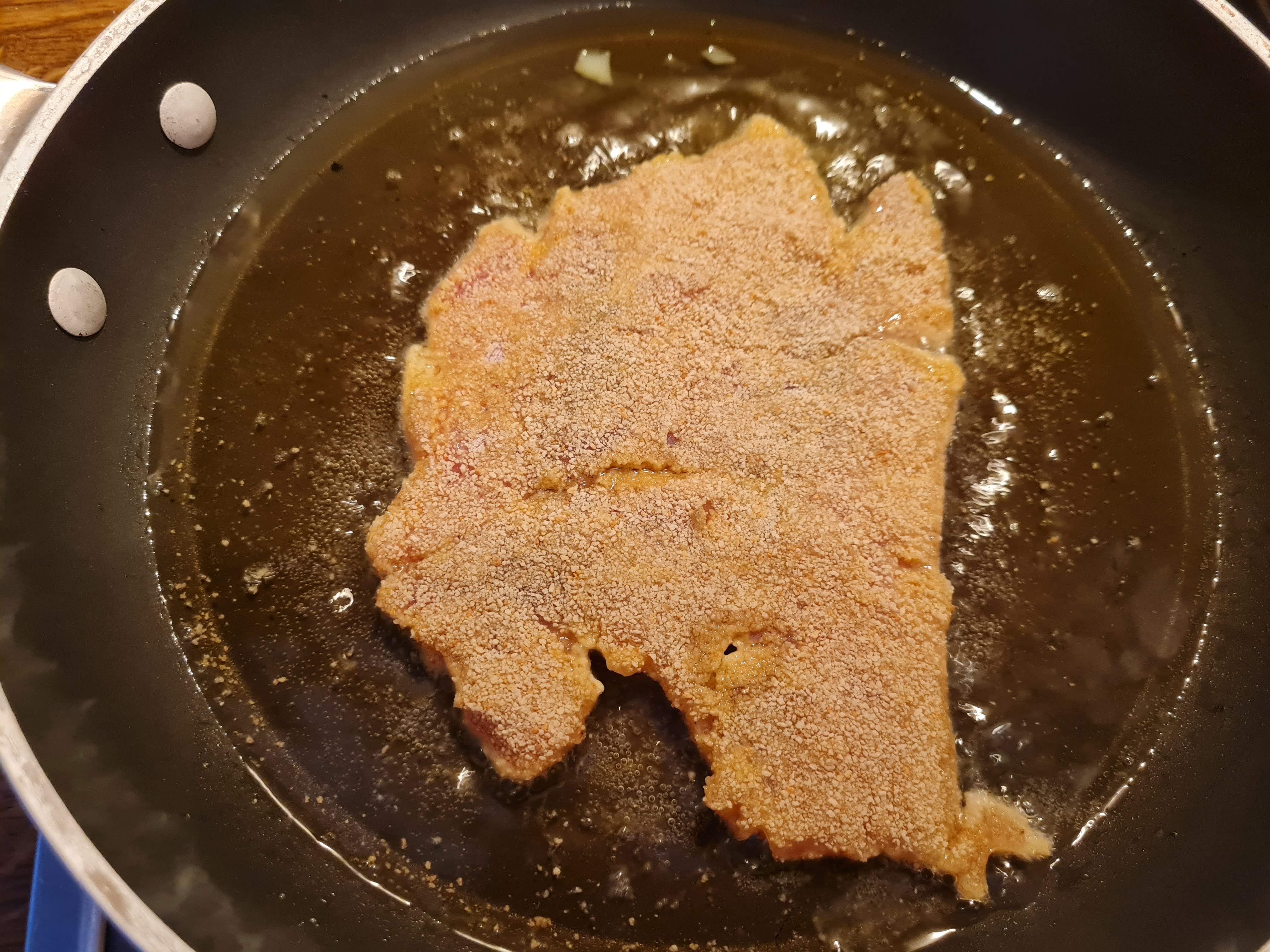 - Когато обърна шницела, с помощта на лъжица поливам с мазнината от тигана.