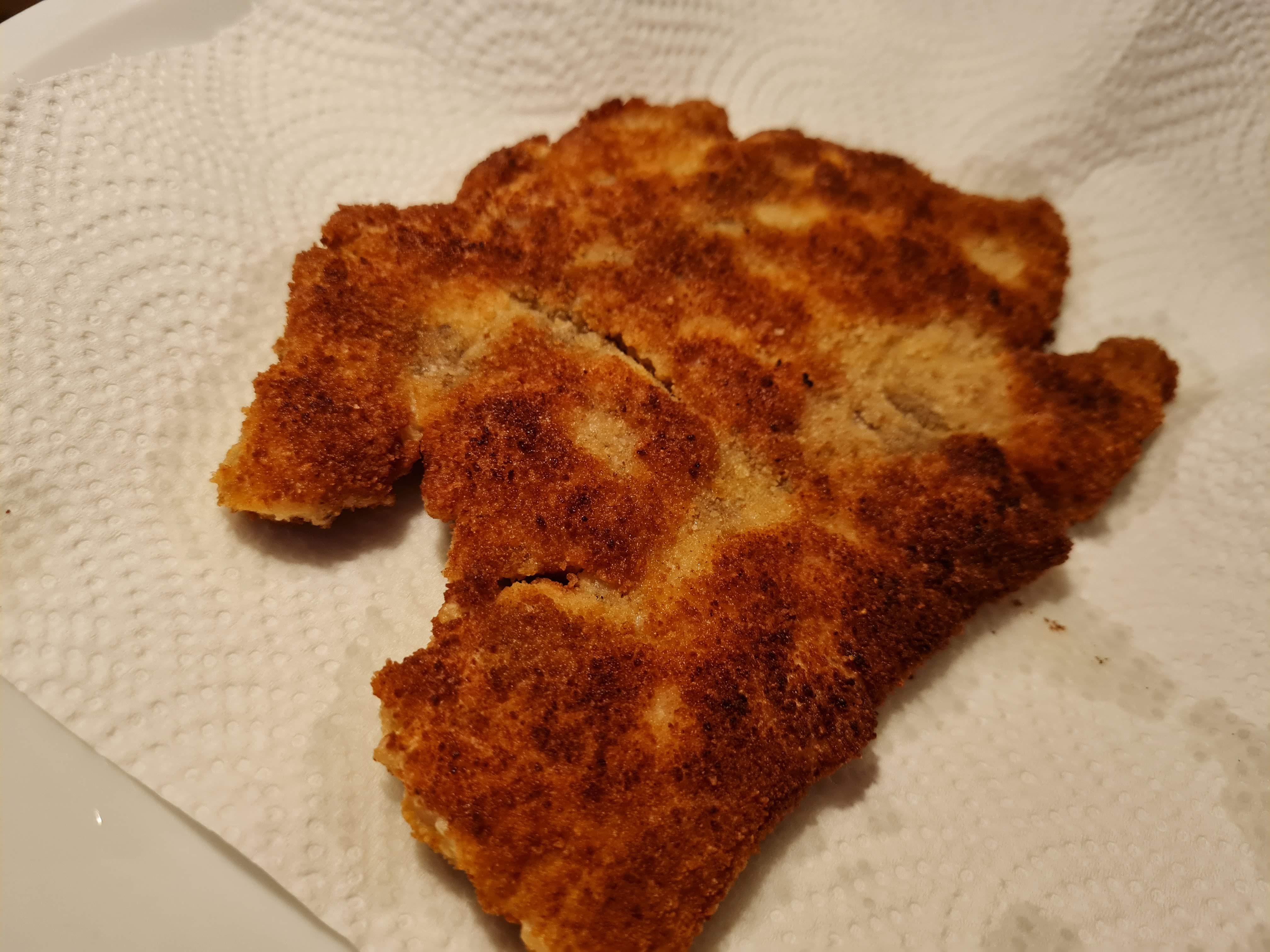 - Изваждам шницела върху домакинска хартия, за да се отцеди излишната мазнина.