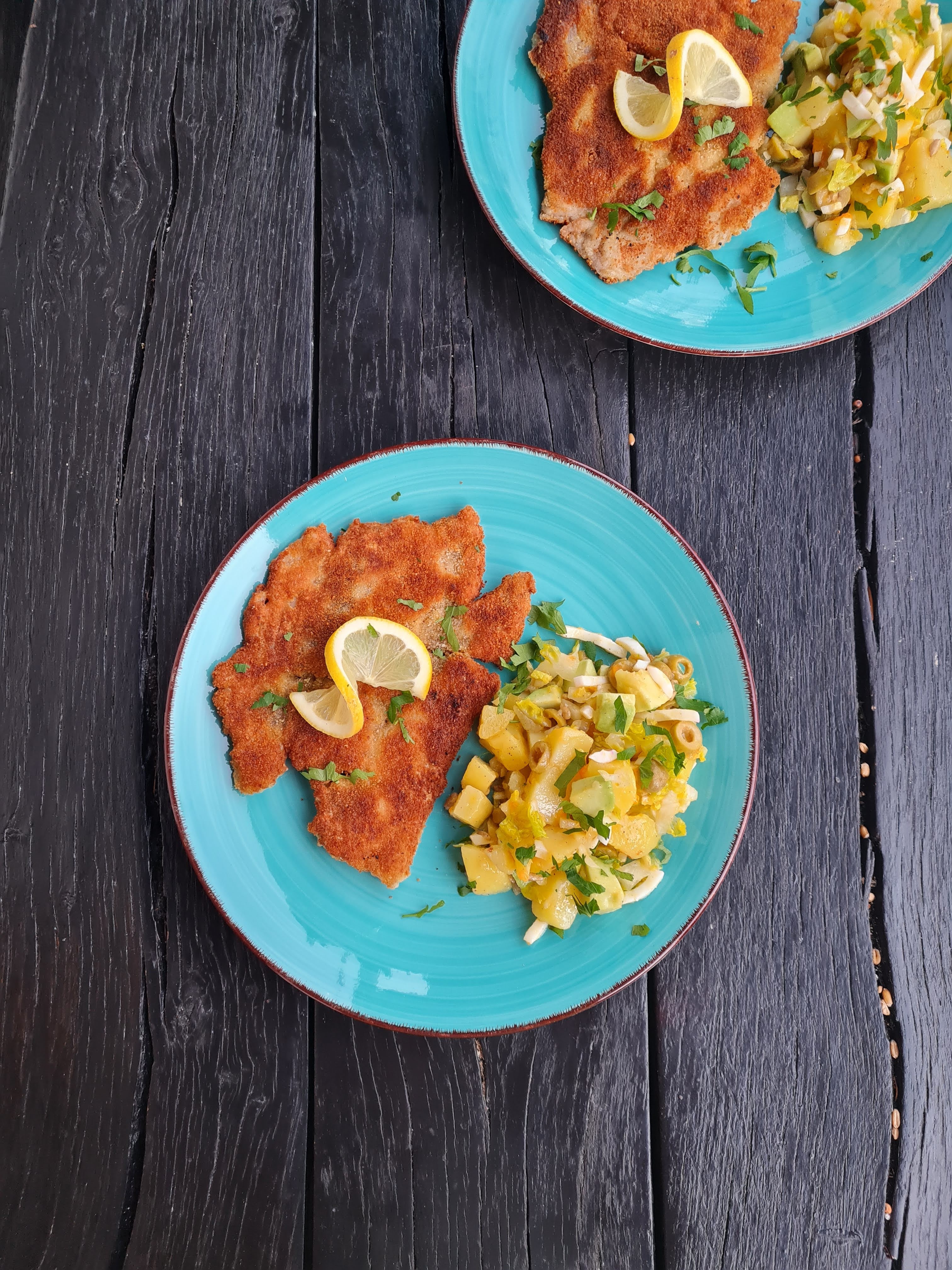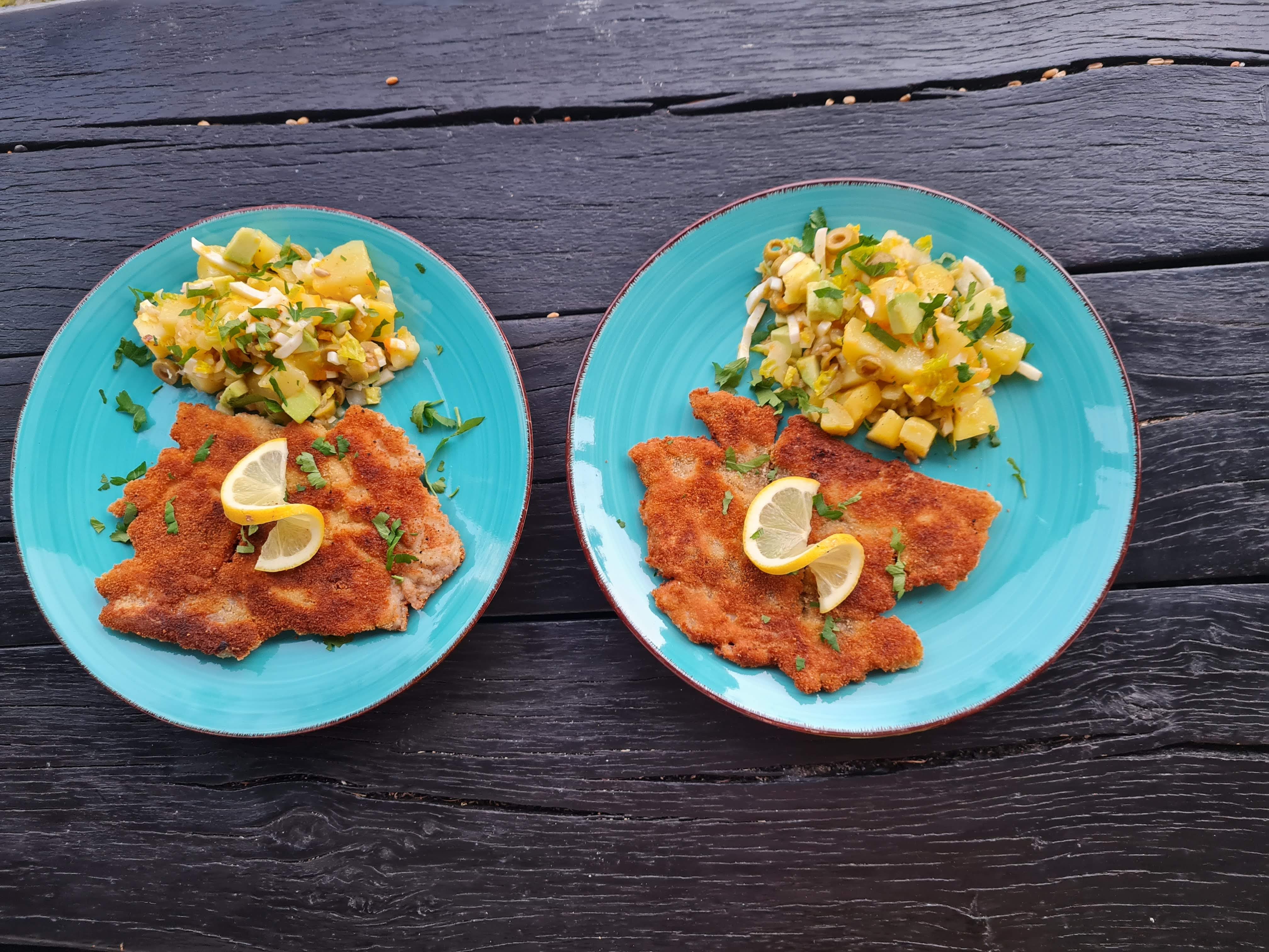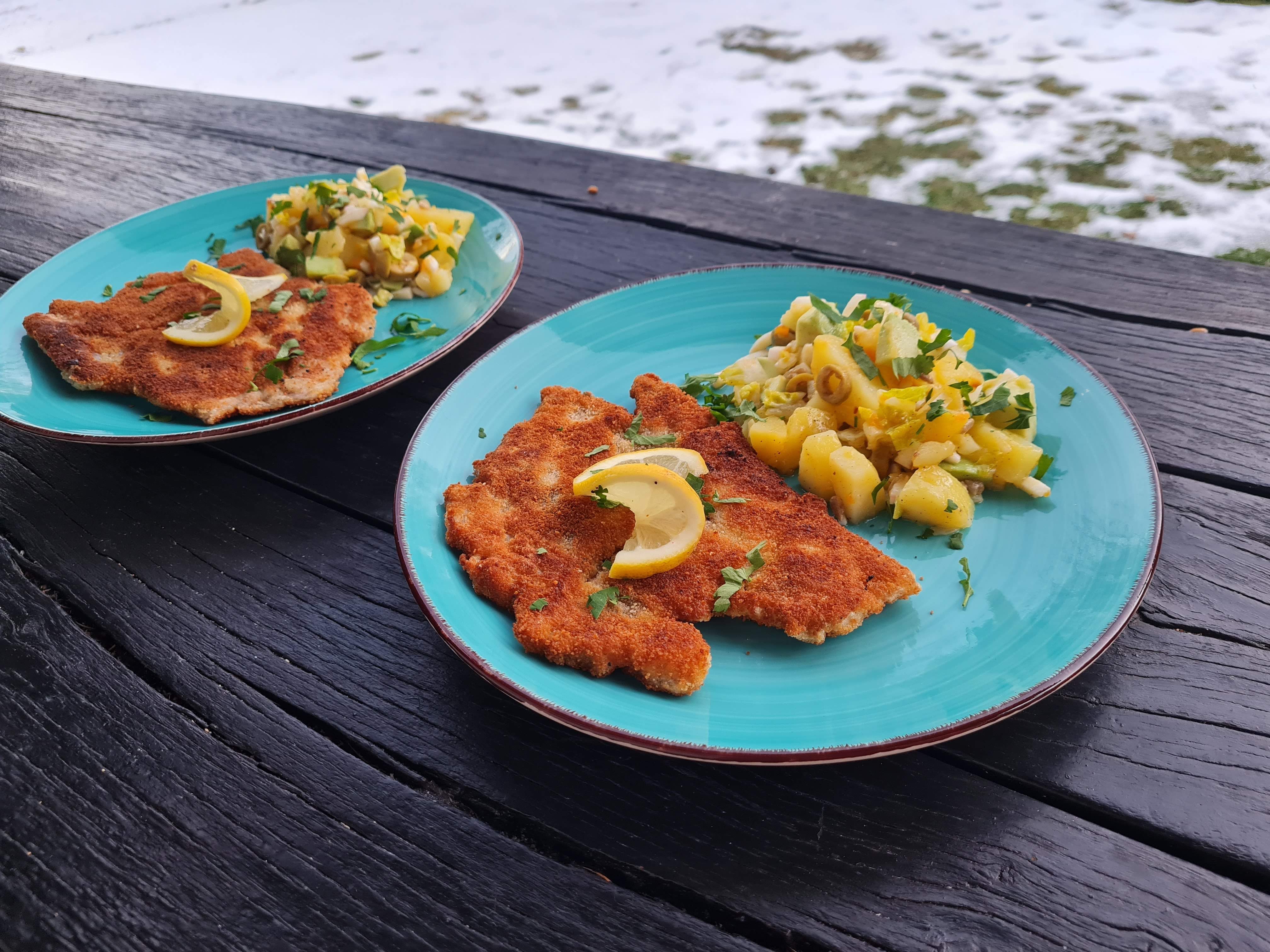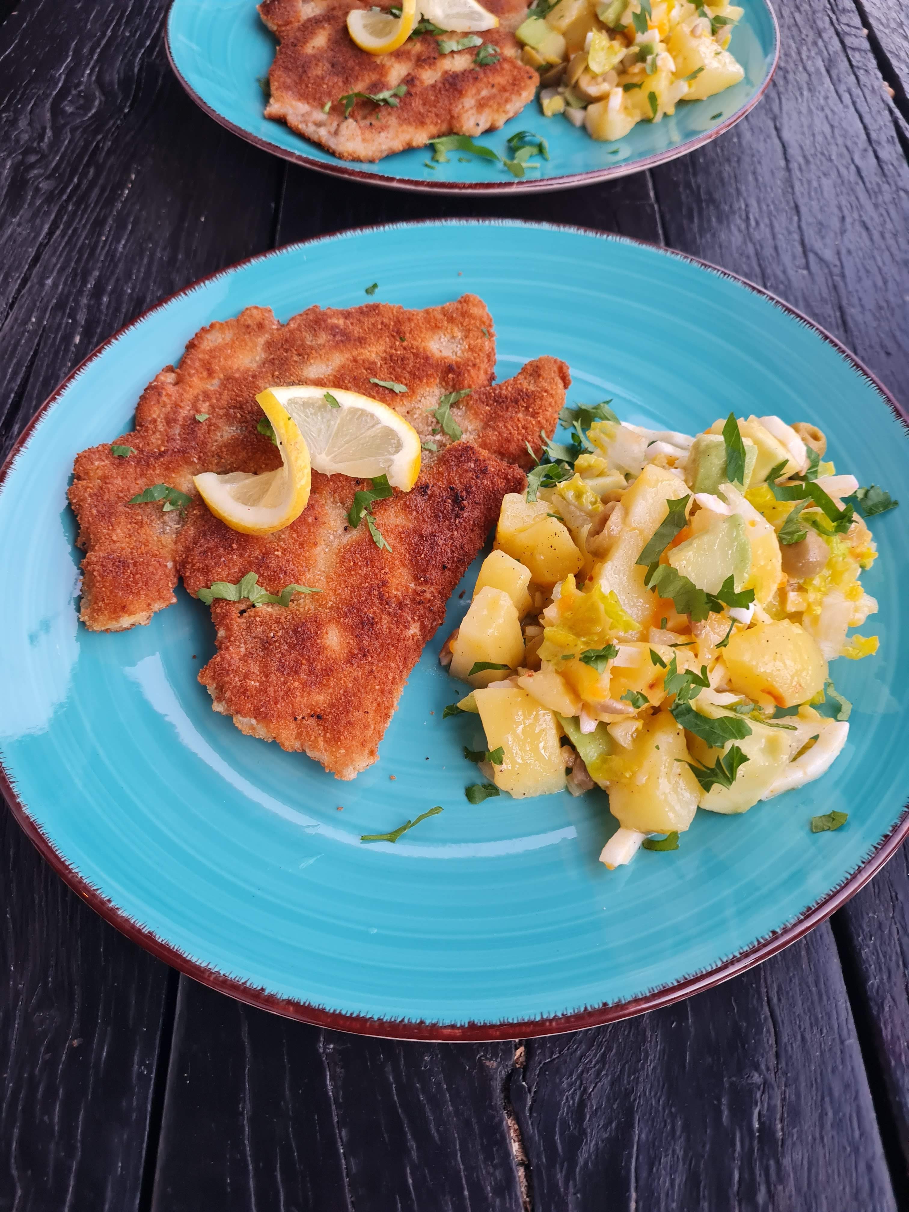 - Сервирам шницелите от шарана още топли с гарнитура от картофена салата с авокдо, поръсена обилно с магданоз.