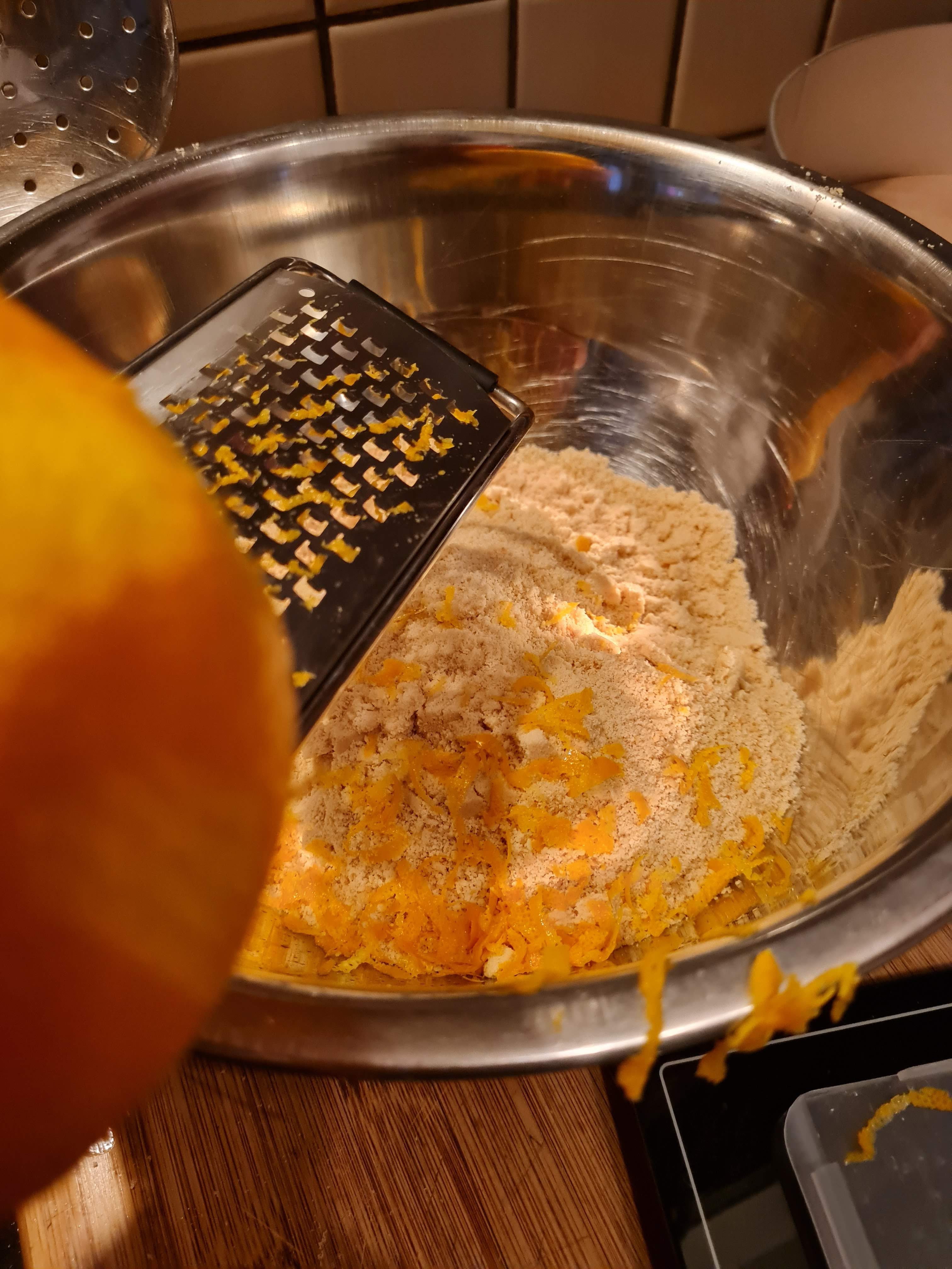 - Изсипвам в купа и настъргвам добре измитата кора на портокала.