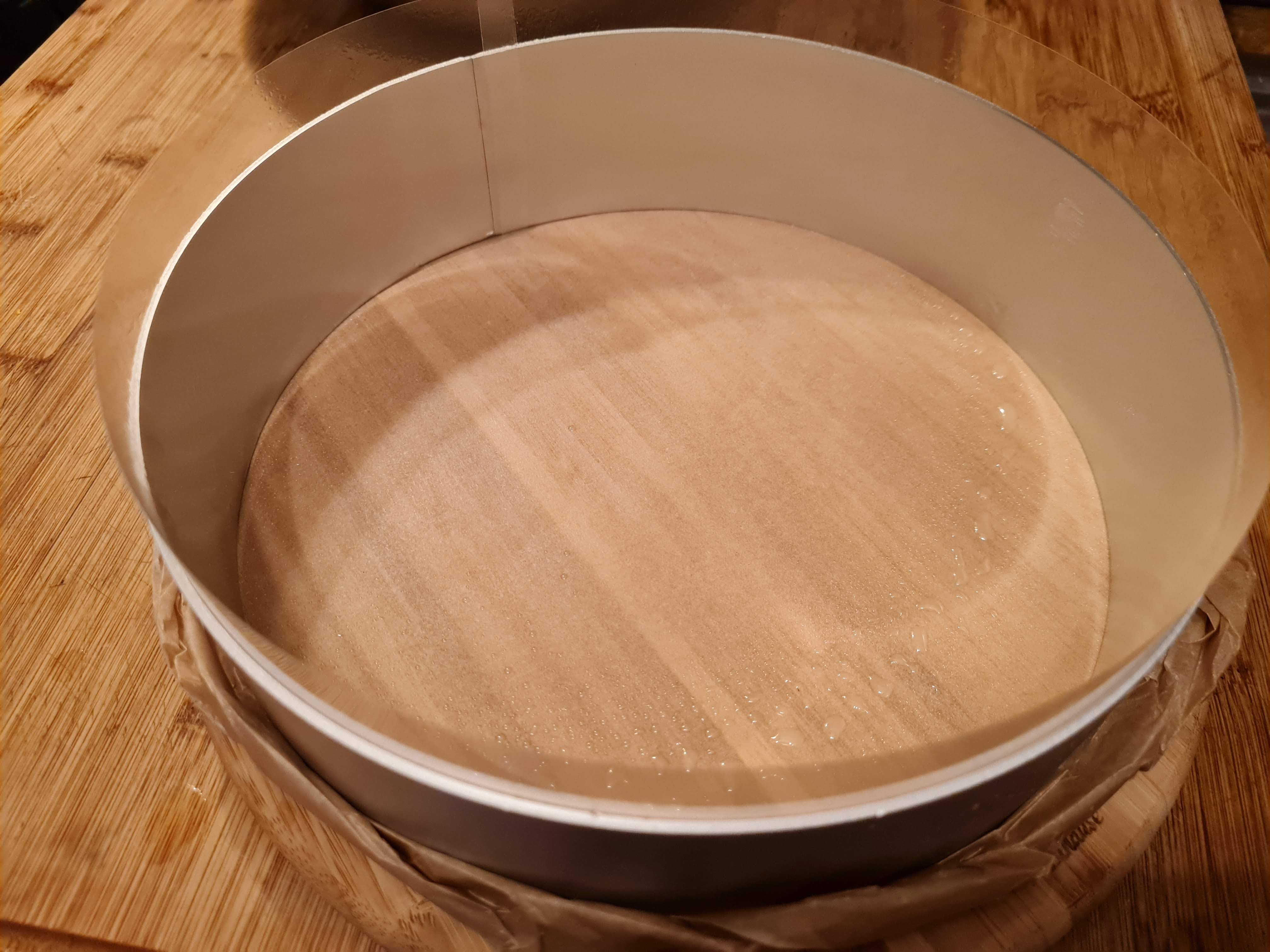• Подготвям ринга за торта с размер 22 см, като го слагам върху хартия за печене и я набирам около него. Аз нямам форма с падащи стени, този размер и затова използвам ринга. Вътре в ринга слагам ацетатно фолио, което пък напръсквам с мазен спрей. После при отделянето му нямам никакъв проблем.