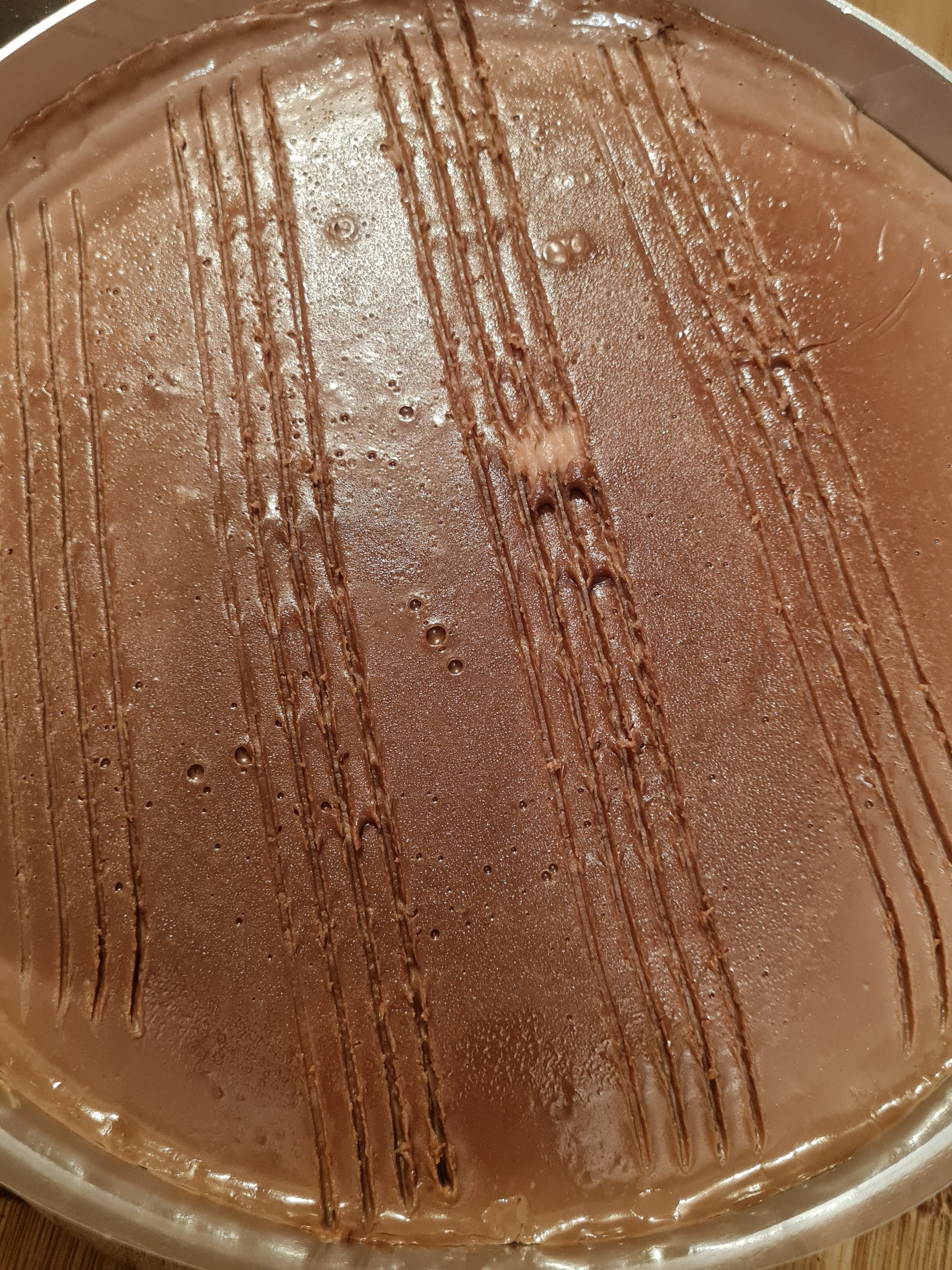 - Горещата шоколадова смес изсипвам върху много добре стегнатша блат и прибирам