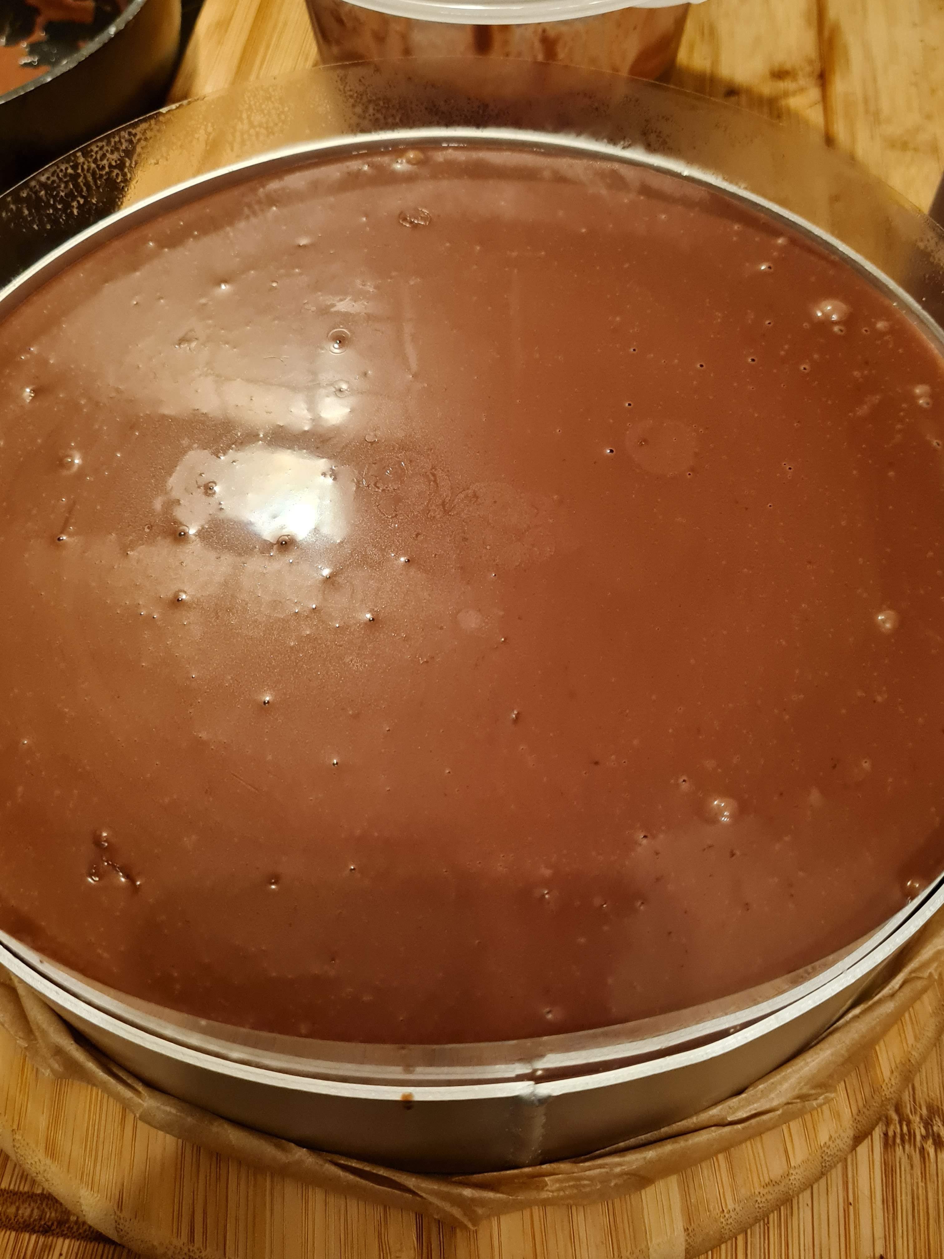 • Когато преценя, че белият слой от тортата е достатъчно стегнат, подготвям по същия начин млечния шоколад.