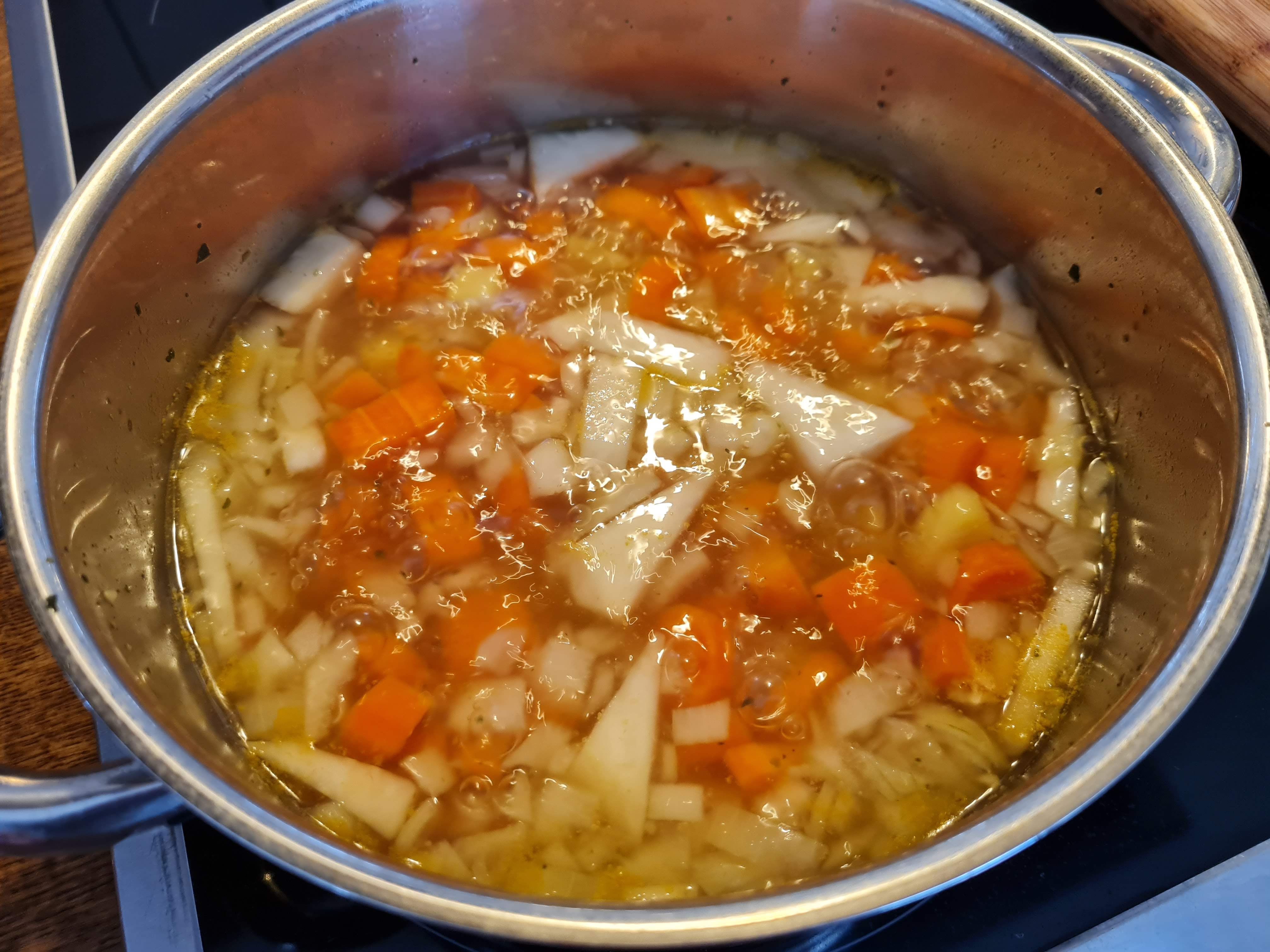 • Слагам на котлона и варя около 20 минути, или докато зеленчуците са напълно сварени.