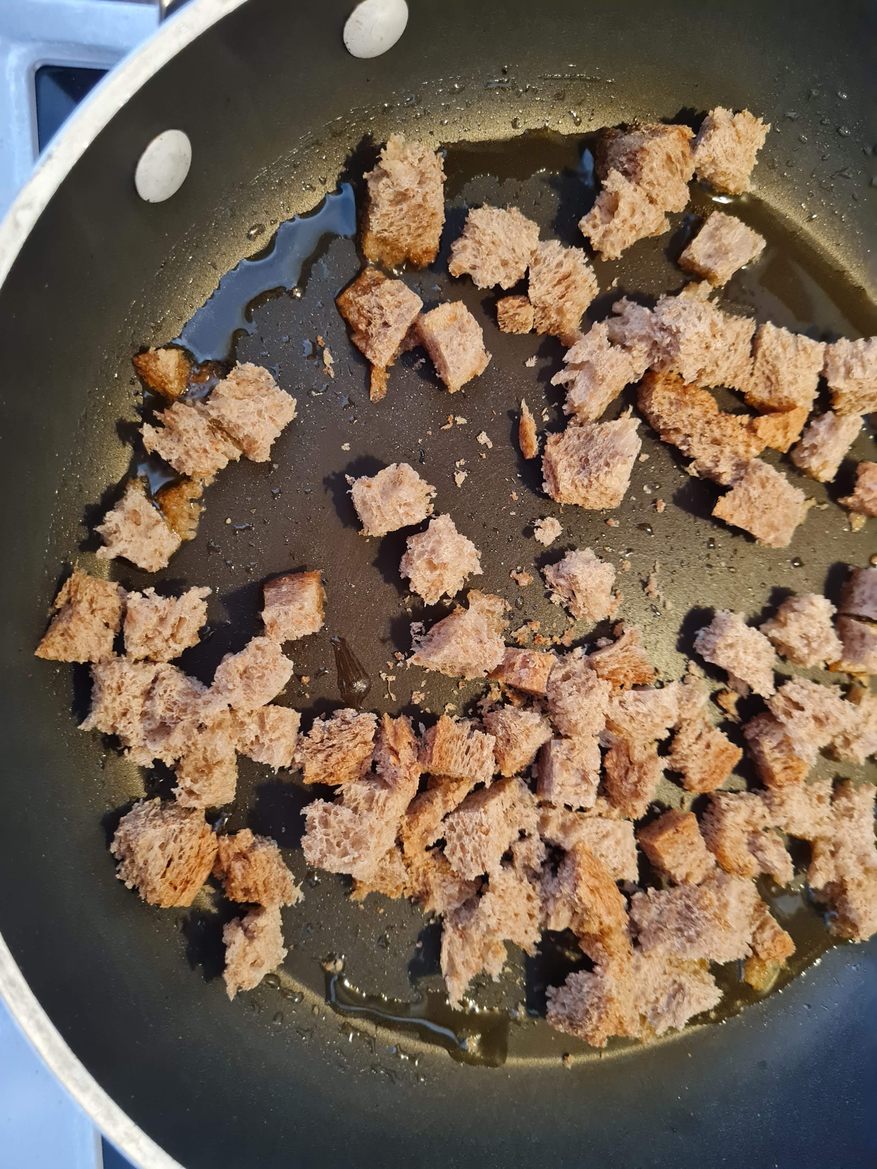 • Загрявам в тиган маслото и изпържвам на силен котлон, и с непрекъснато разбъркване крутоните до хрупкавост.