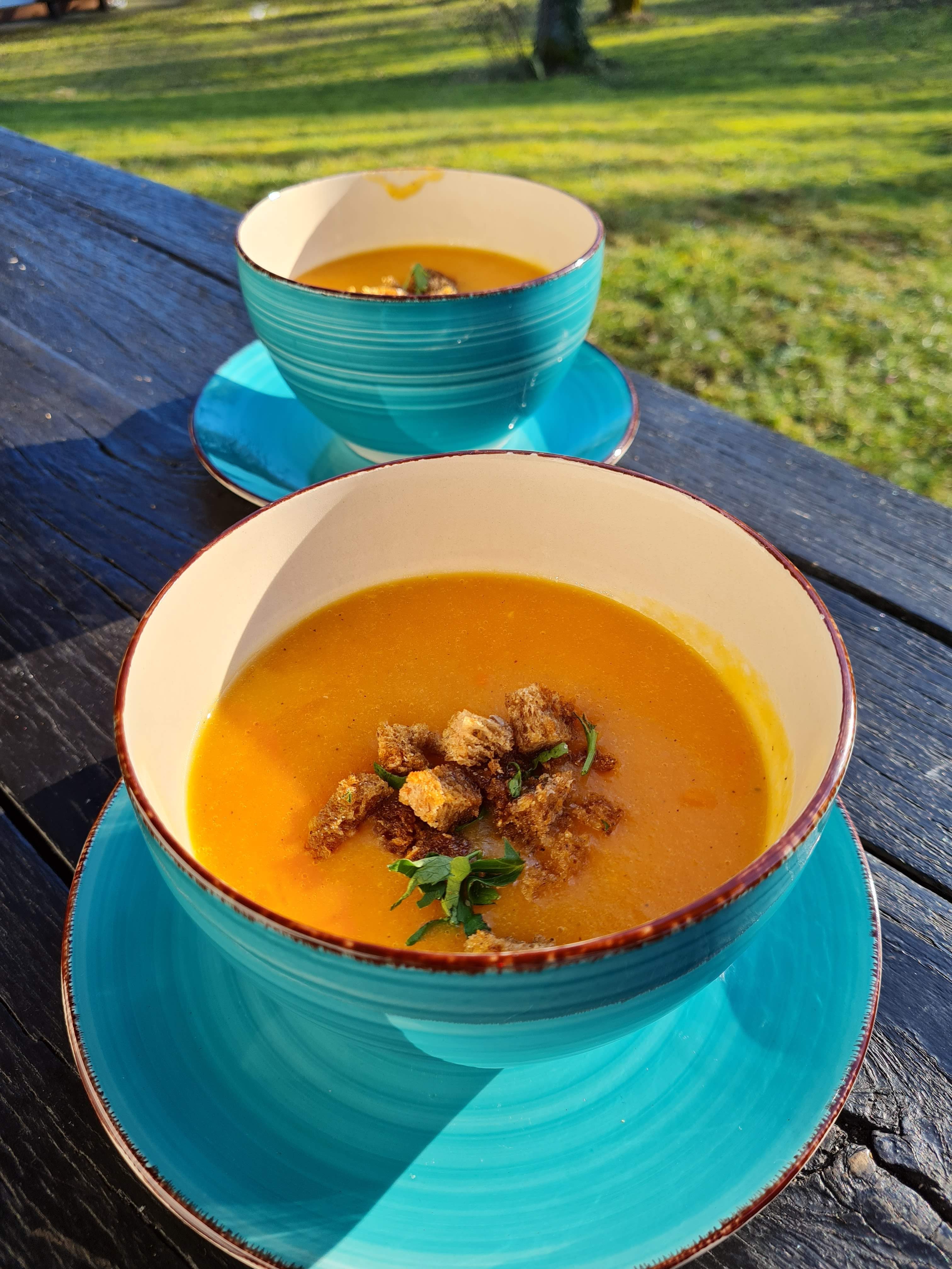 • Сервирам супата гореща и поръсена с пълнозърнести крутони.