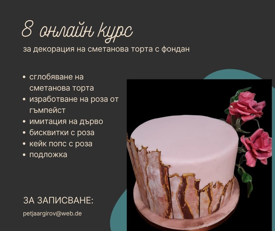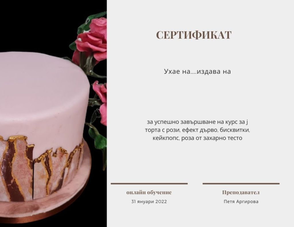 • След представена готова торта, получавате сертификат за завършен онлайн курс.