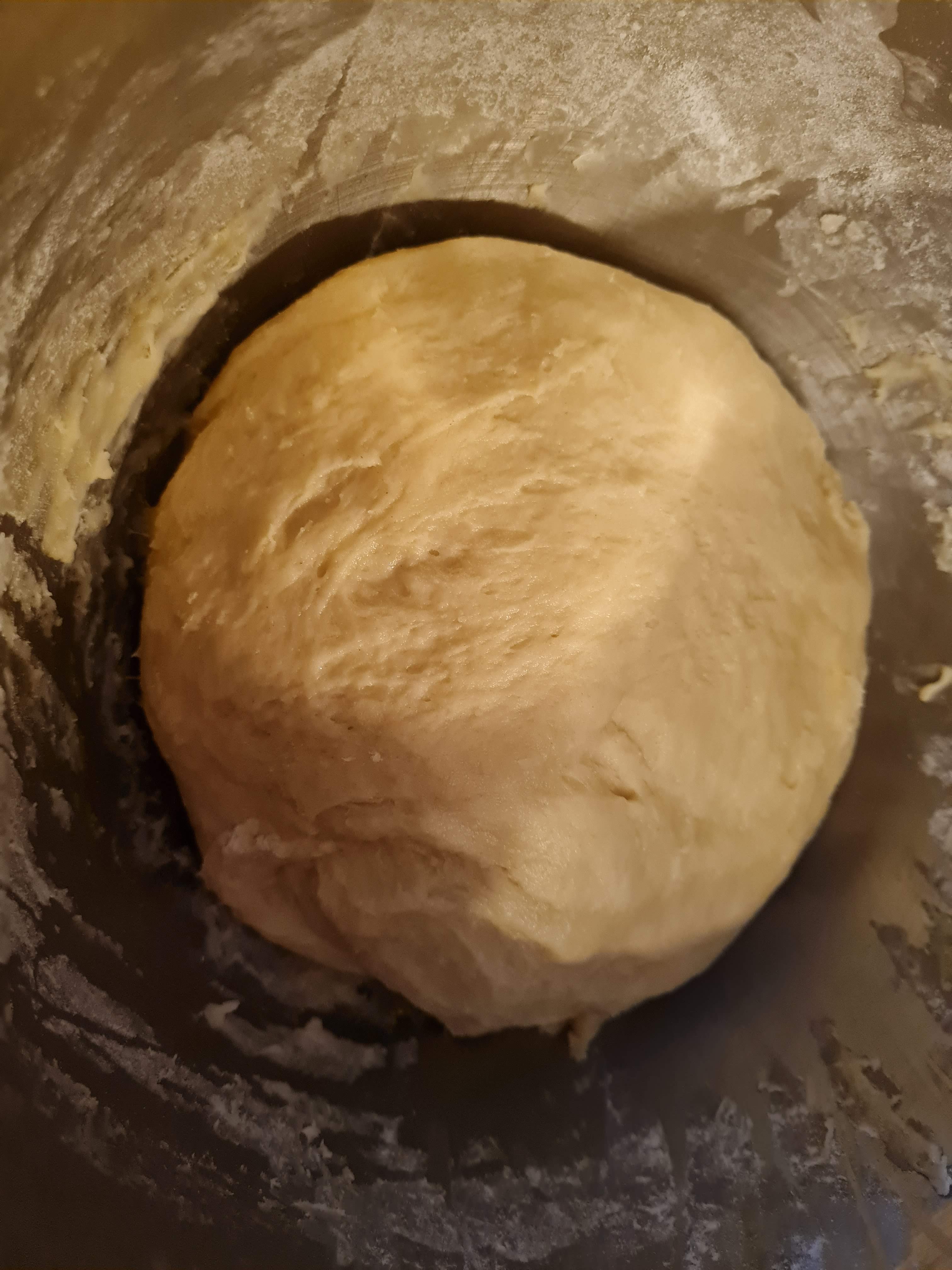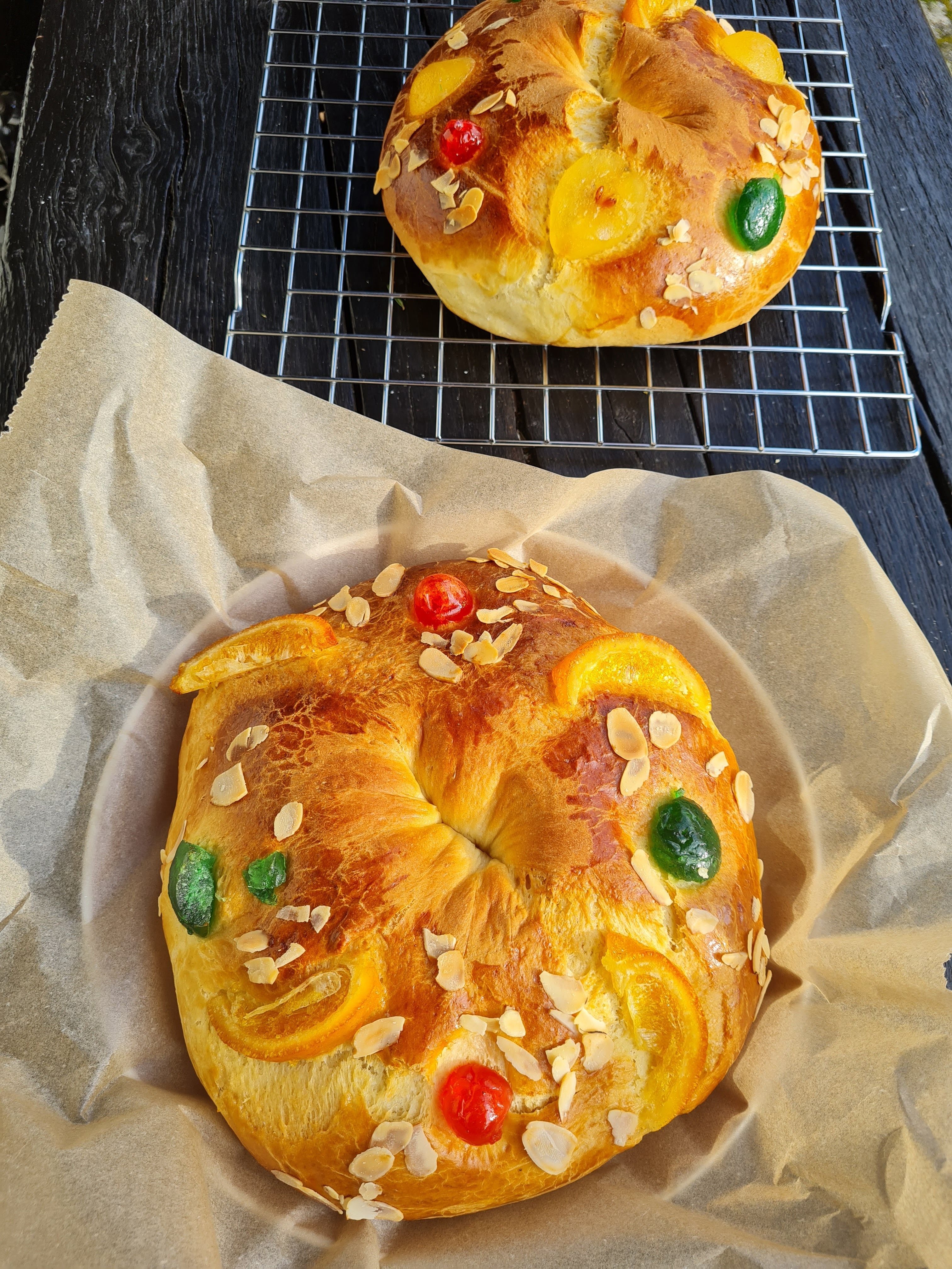 Еееее, ама много е специален този испански козунак с име Roscón de Reyes! Ама не му намирайте махна, че си нямал дупка. Няма си, защото исках да си спестя печенето на двата броя и ги сложих заедно в тавата. Не го правете, ако искате да остане с формата на геврек – голям геврек.