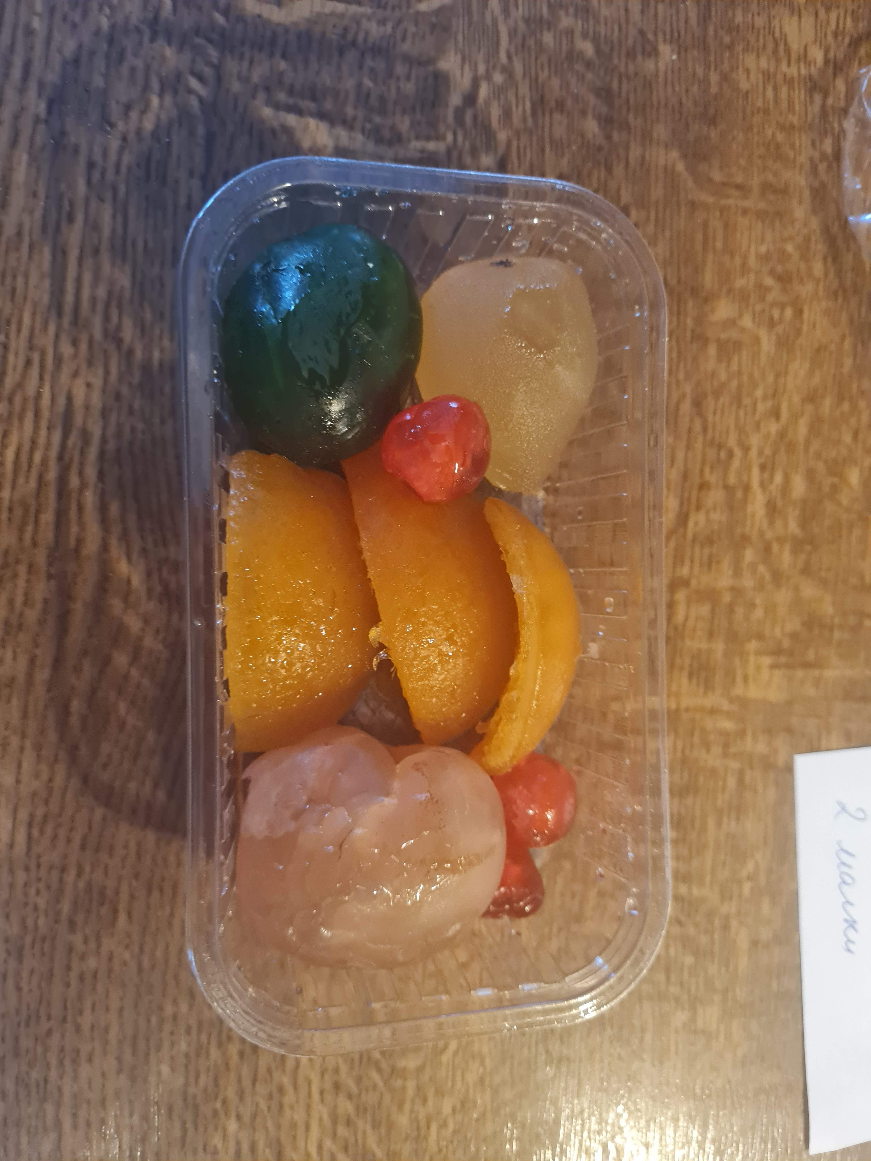 кандирани (захаросани) цели плодове за декорация – моите бяха череша, смокиня, круша, ябълка и портокал
