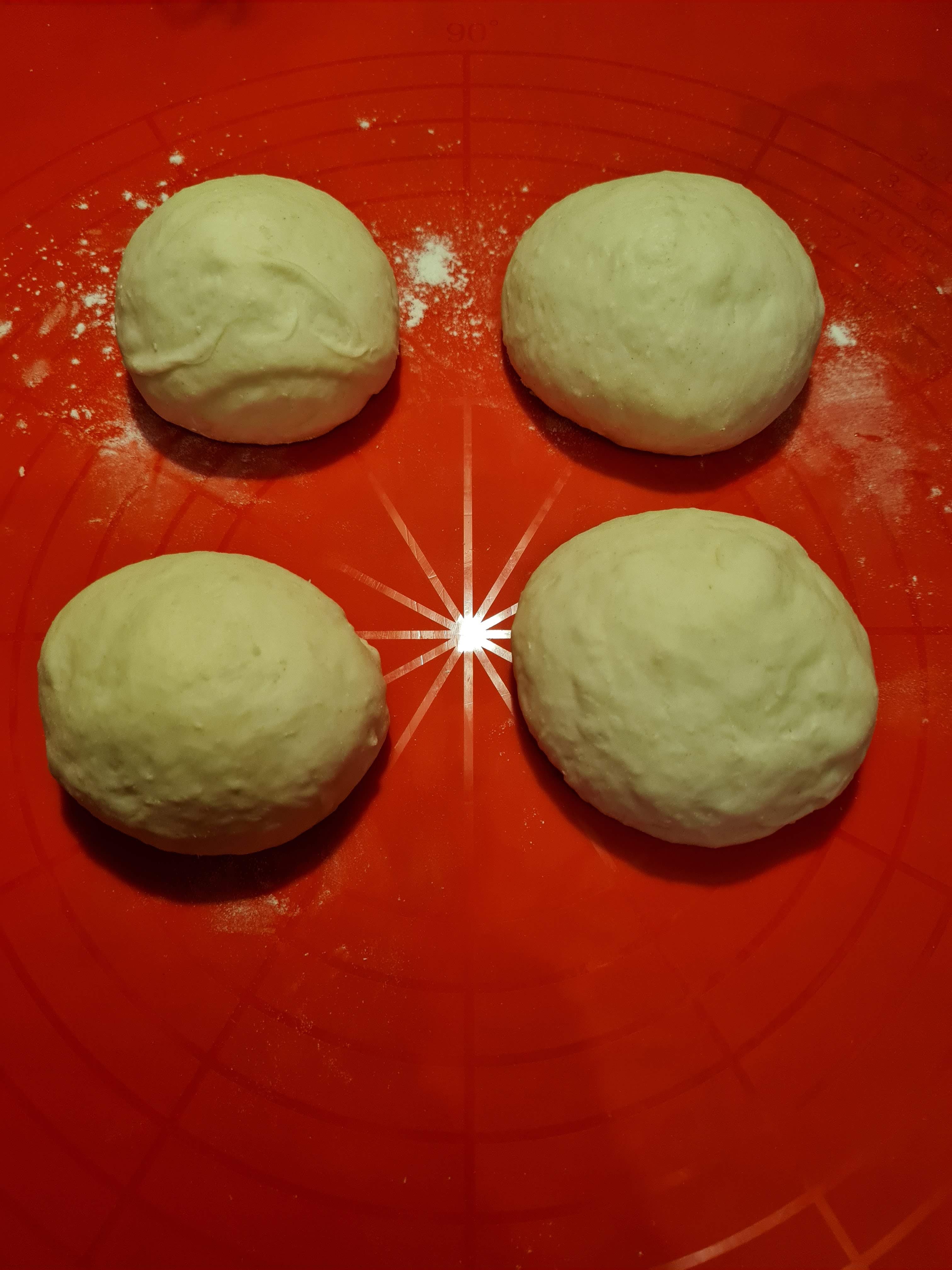 - Изваждам тестото след 12 часа от хладилник и на плота разделям на 4 еднакви топки.