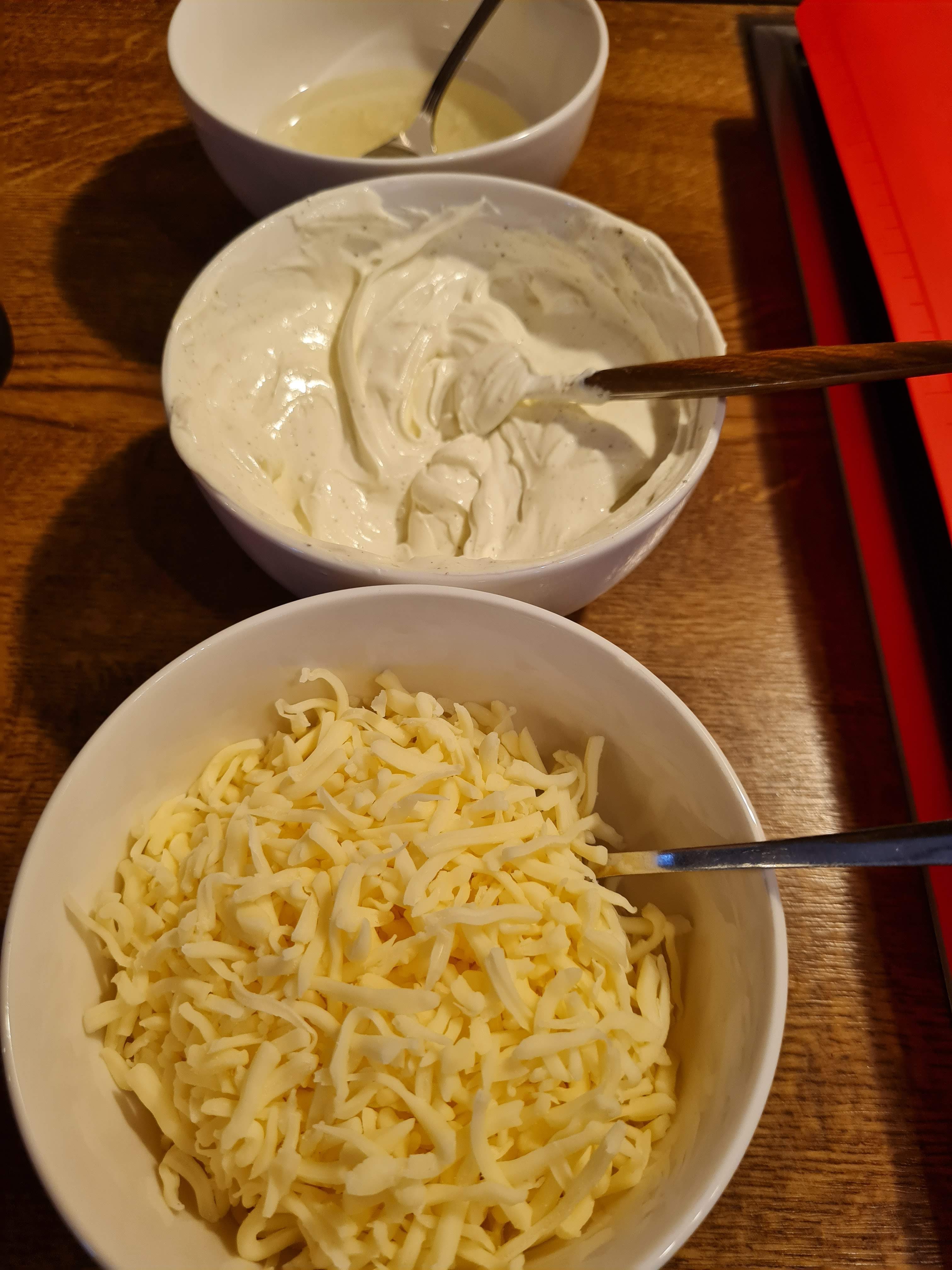 - През това време си подготвям чесновото олио, заквасената сметана и настъргвам кашкавала.