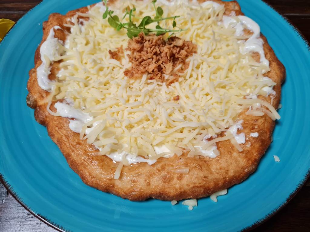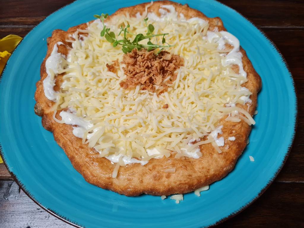 При класическата рецепта за лангош има едно богато на чесън олио, което пък е основата за един вкусен пълнеж от заквасена сметана и настъргана гауда.