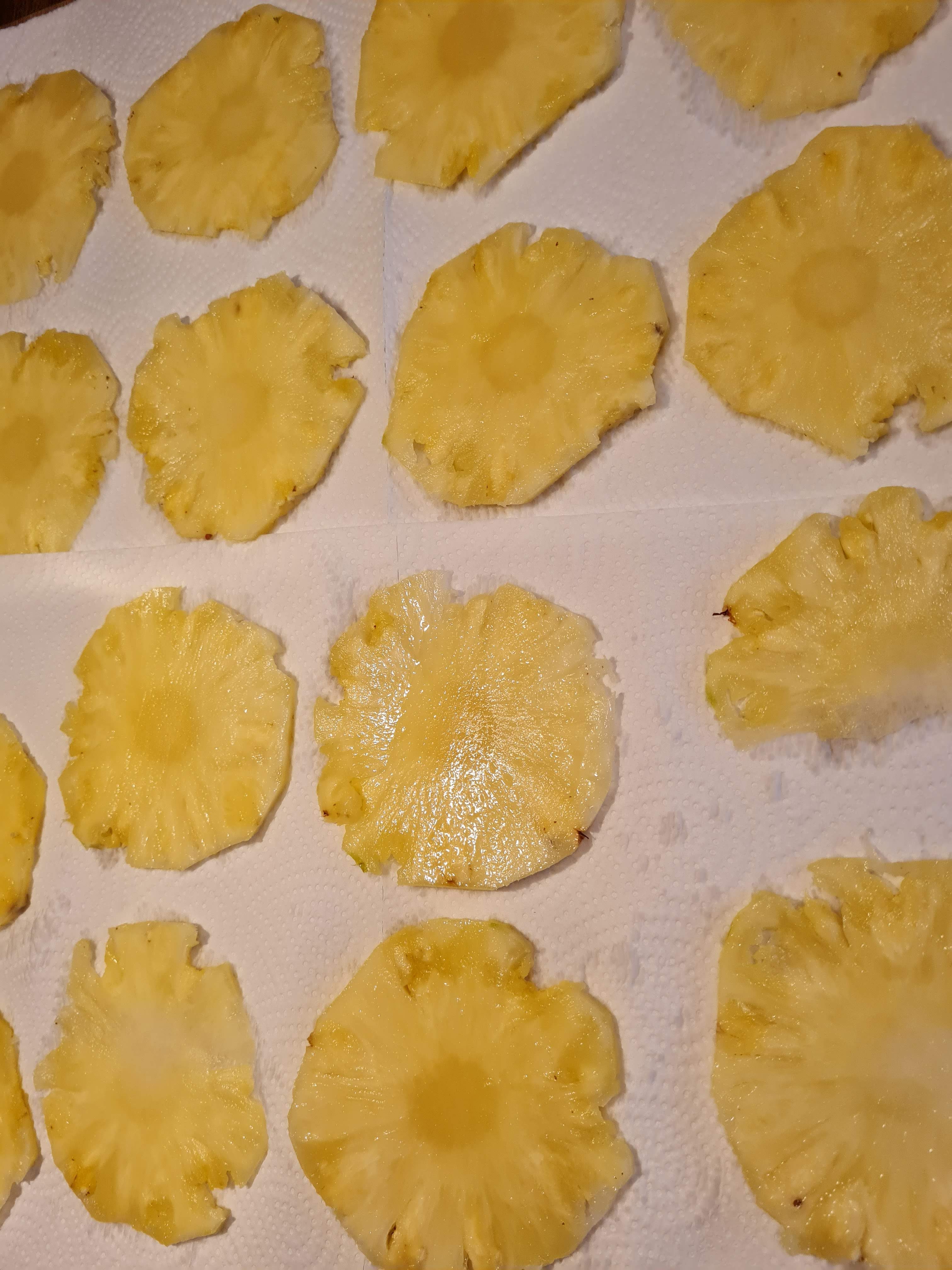 - Слагам филийките ананас в тави с хартия за печене и оставям за 1 час да съхнат във фурната.