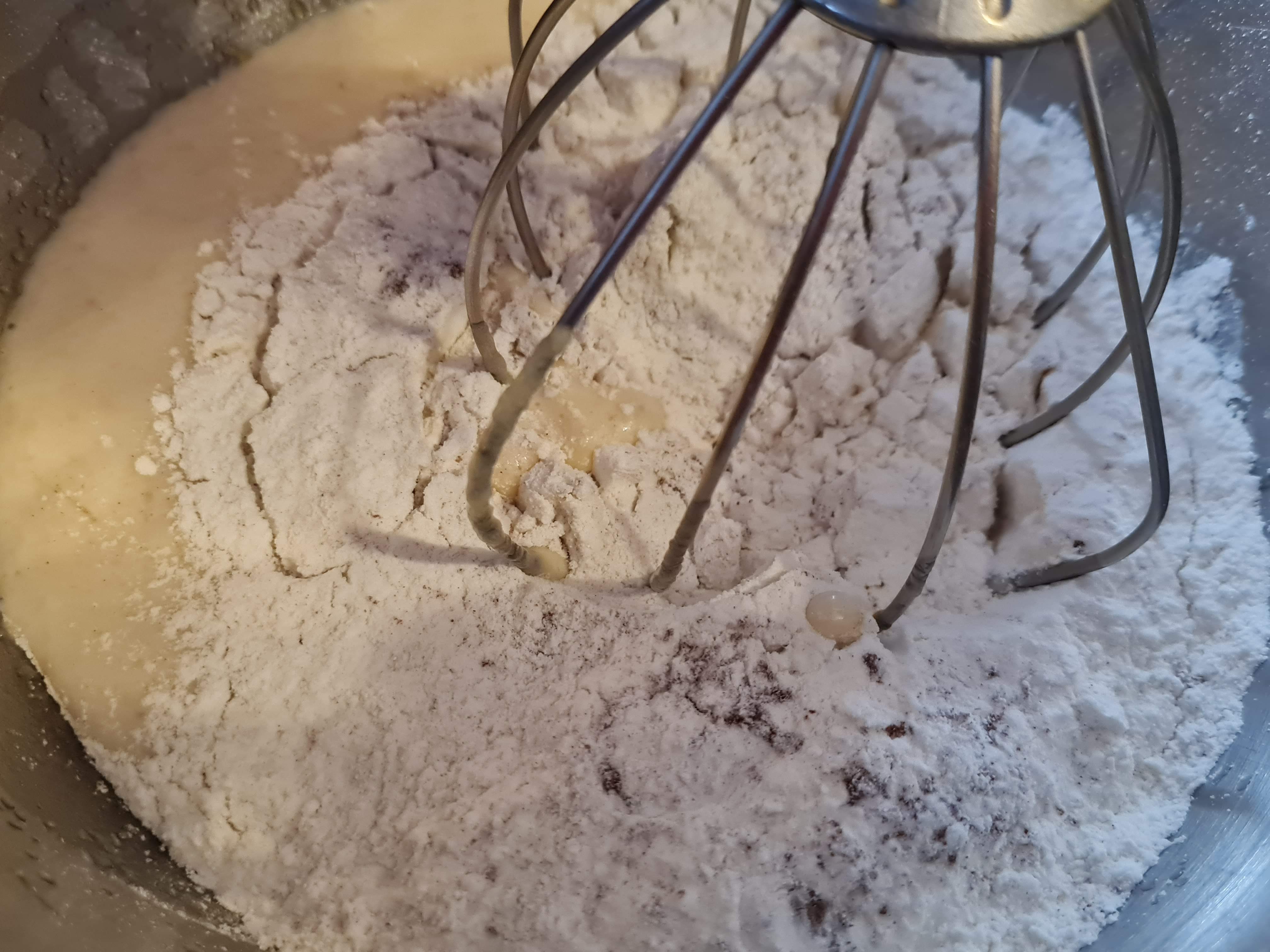 - Сега добавям брашното и разбърквам с тел или с миксер, но само на 1 степен.