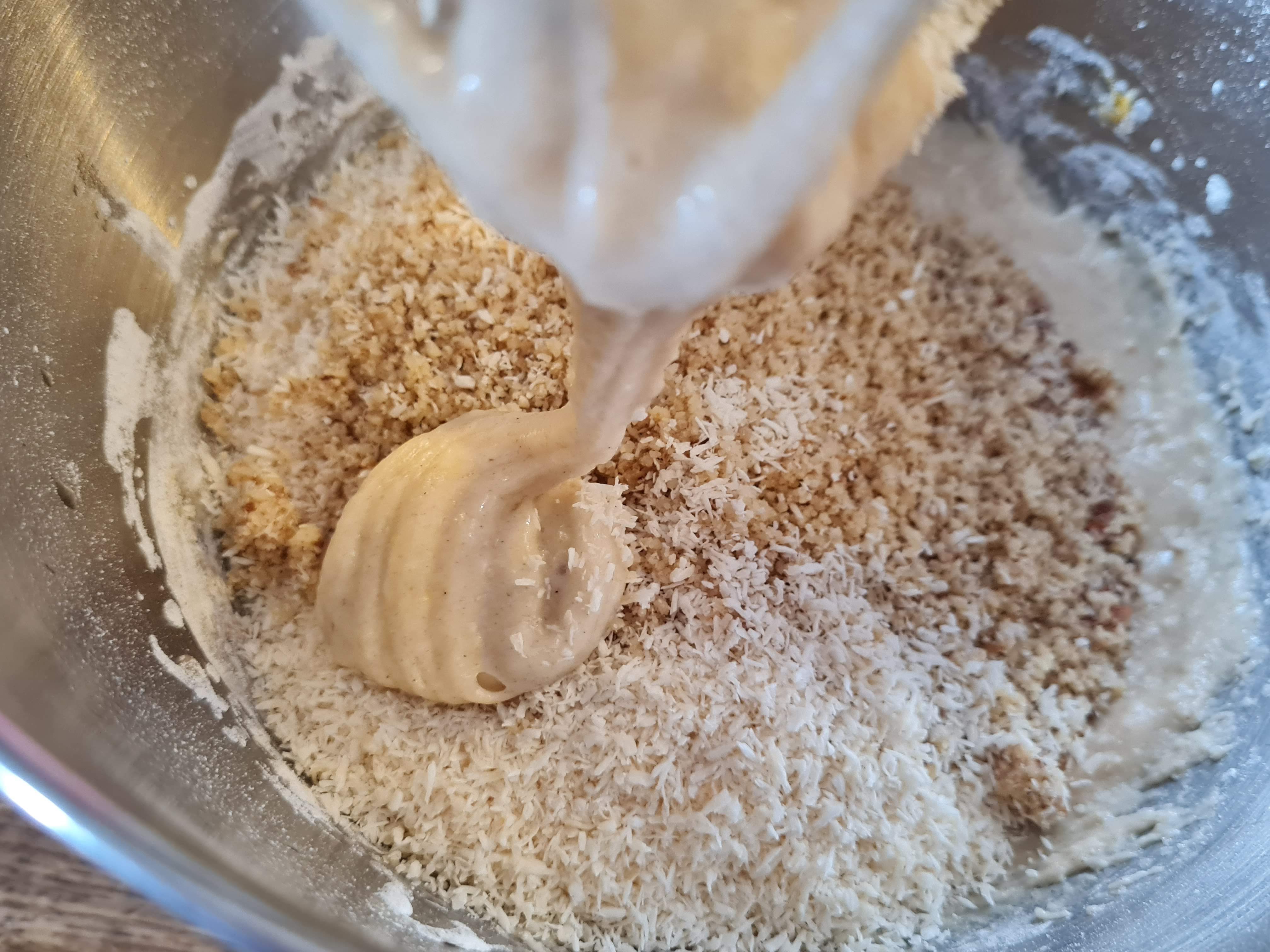 - Най-накрая добавям ядките и разбърквам с тел или миксер, но на 1 степен.