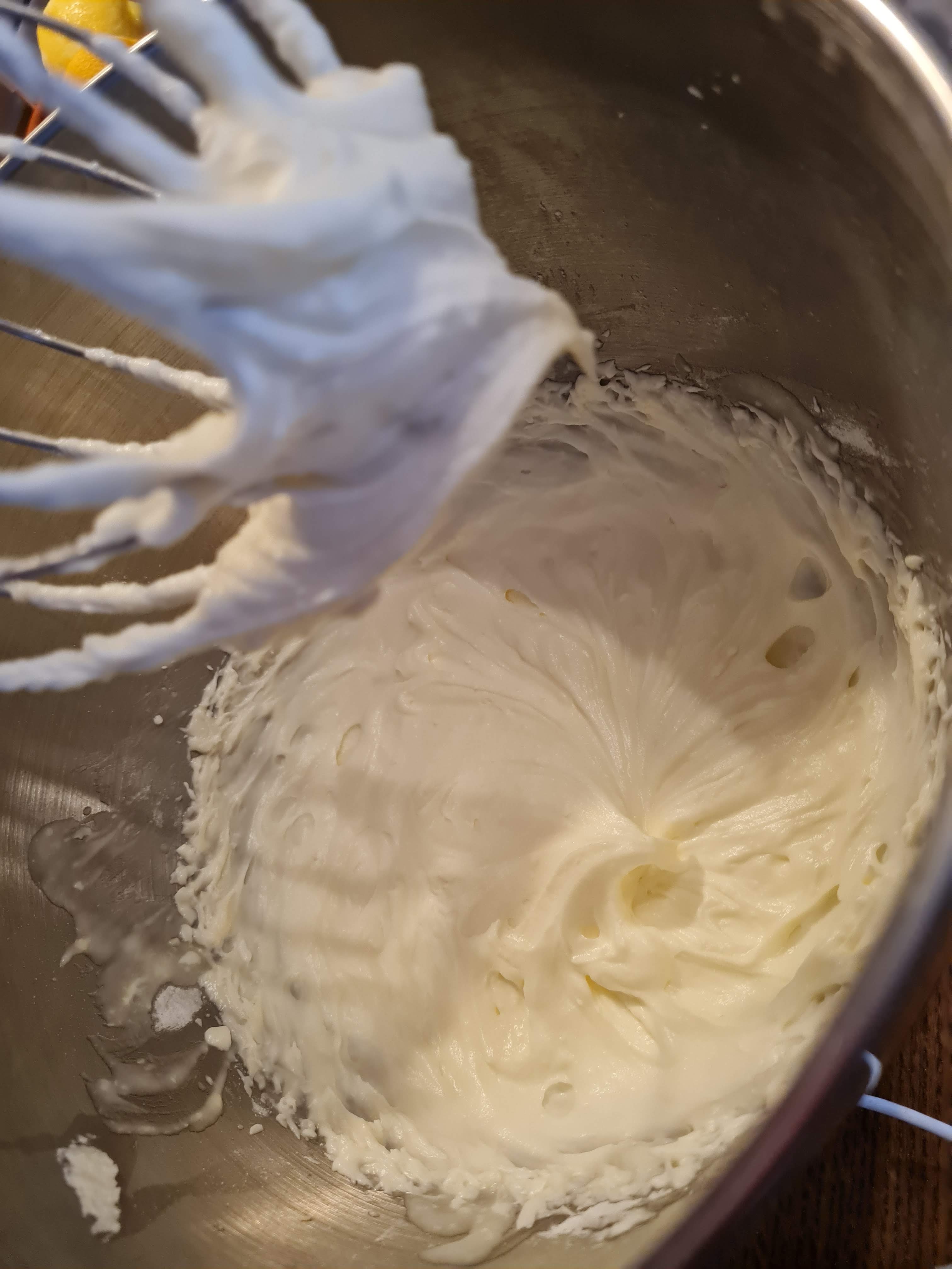- В купата на миксера смесвам крема сиренето, мекото масло, 250 г пудра захар, настърганата кора на лимона и 1 с. л. от сока на лимона.