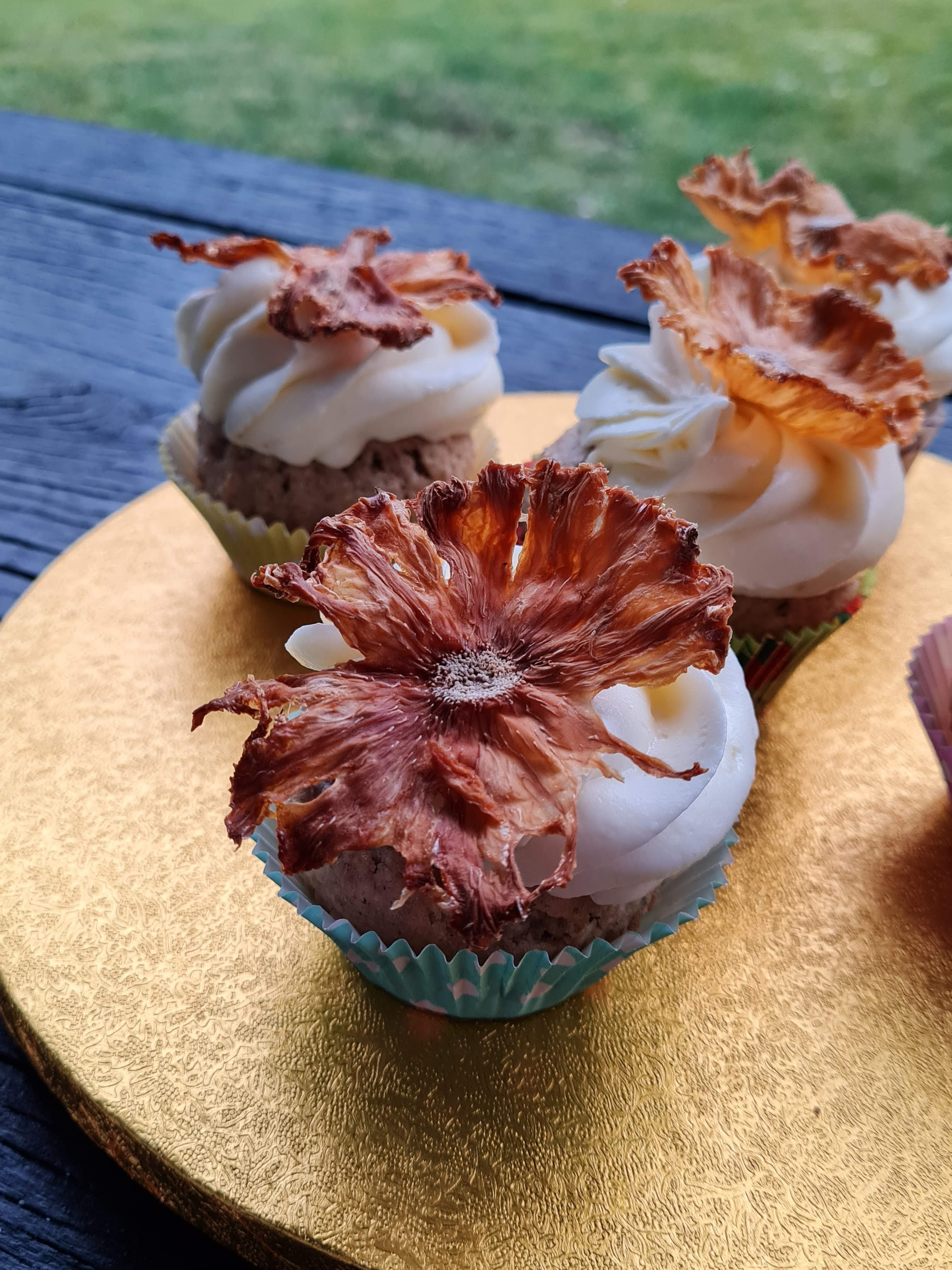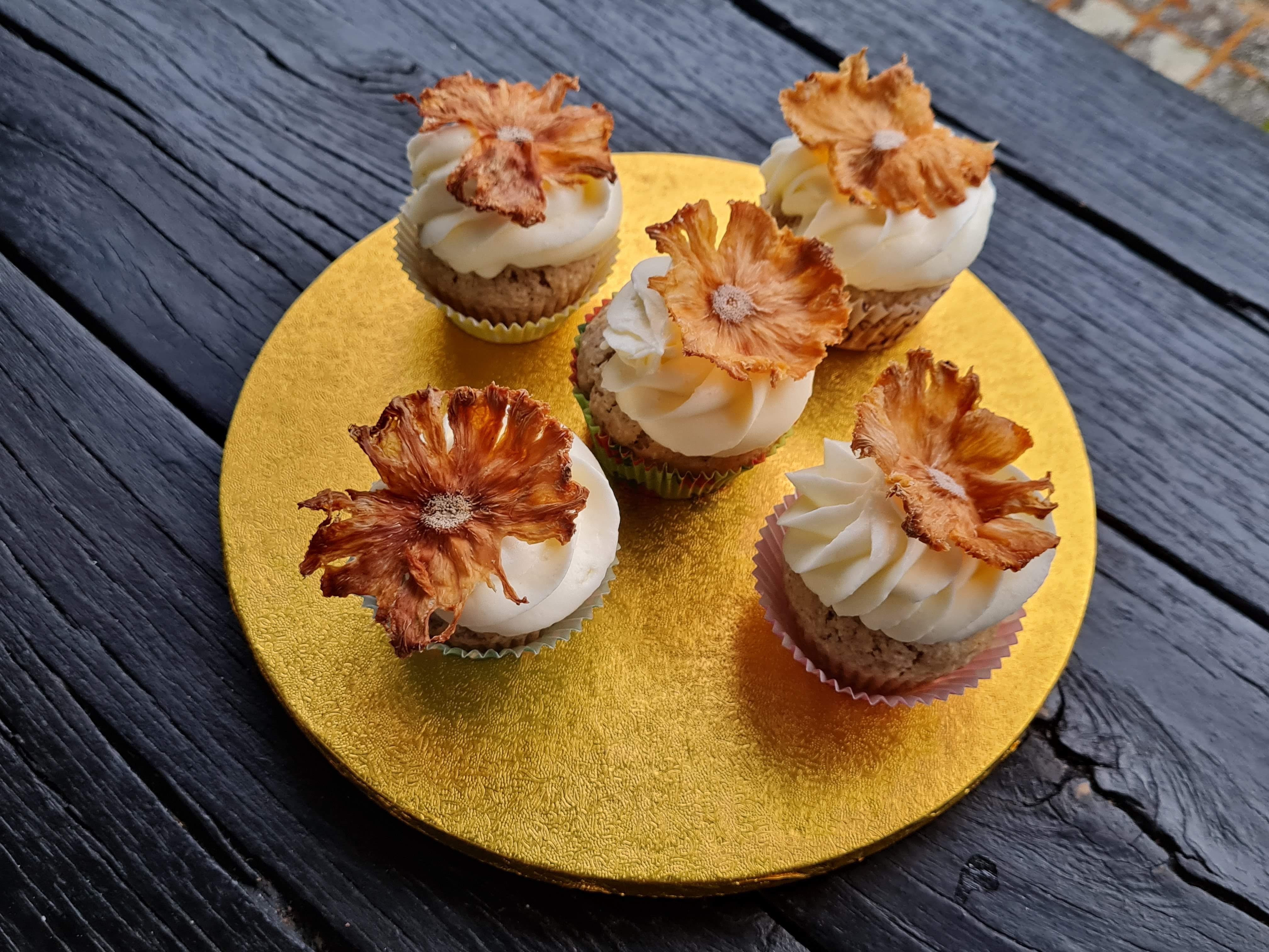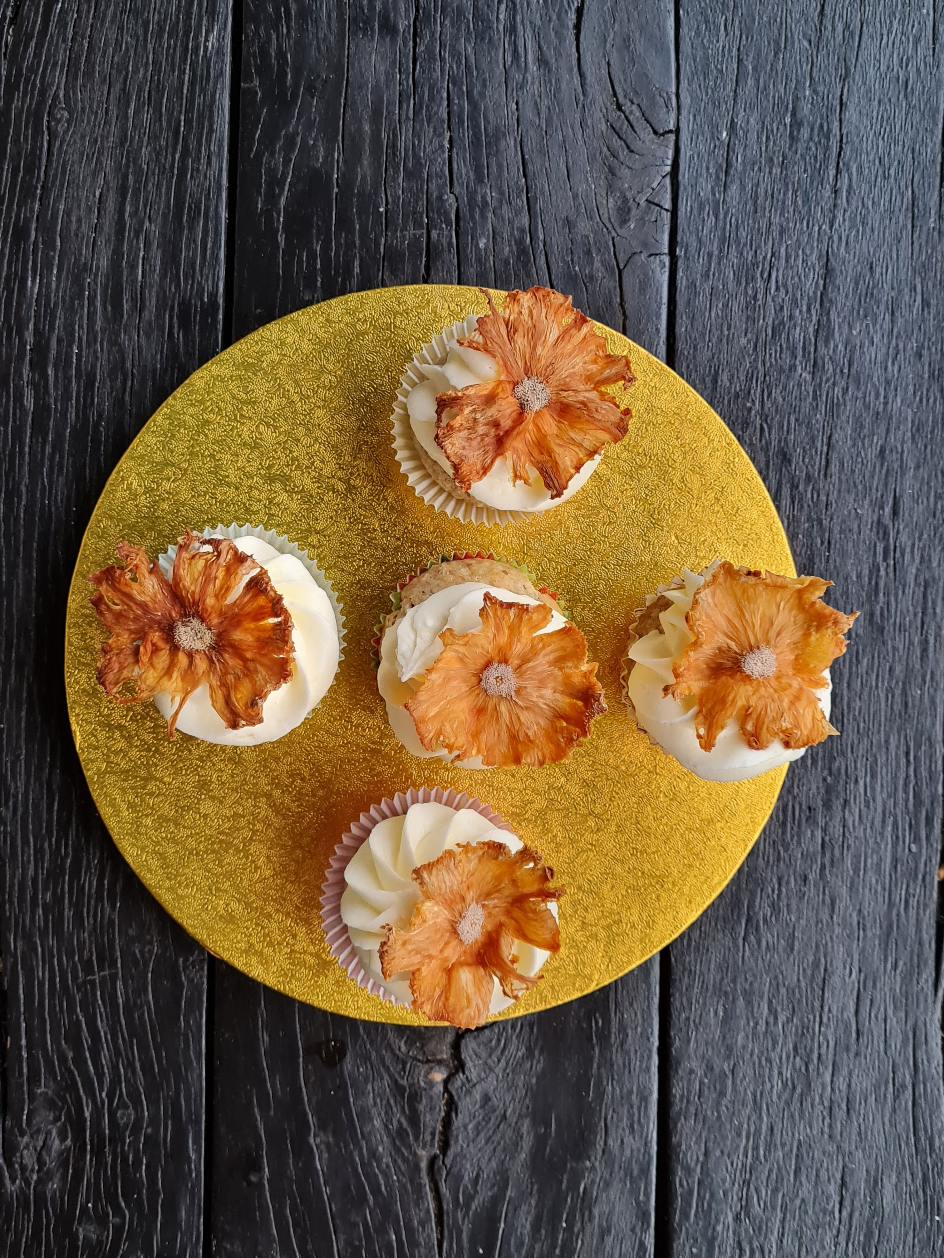 - С шприц декорирам охладените кексчета и върху всяко подреждам по едно цвете от ананас