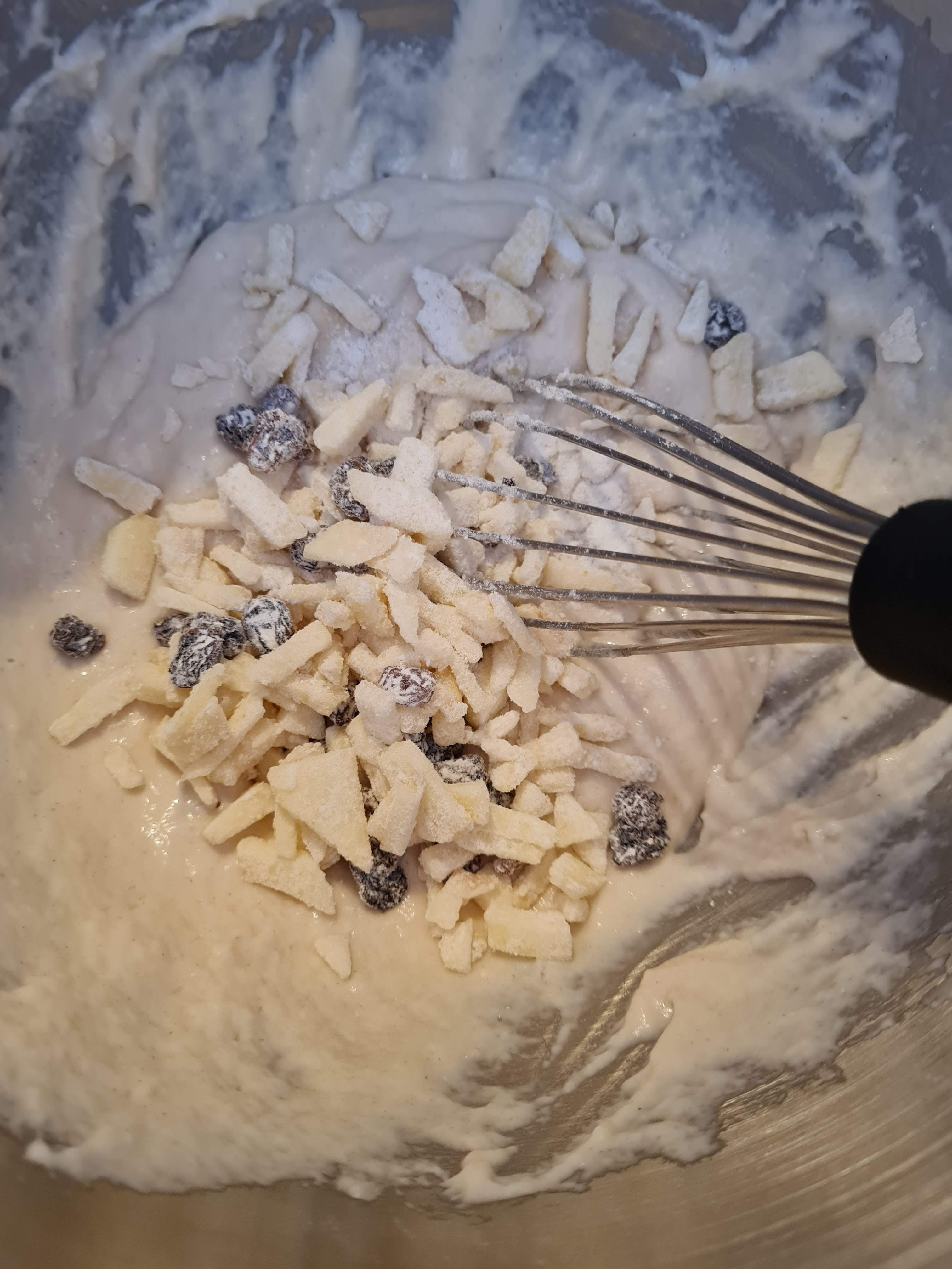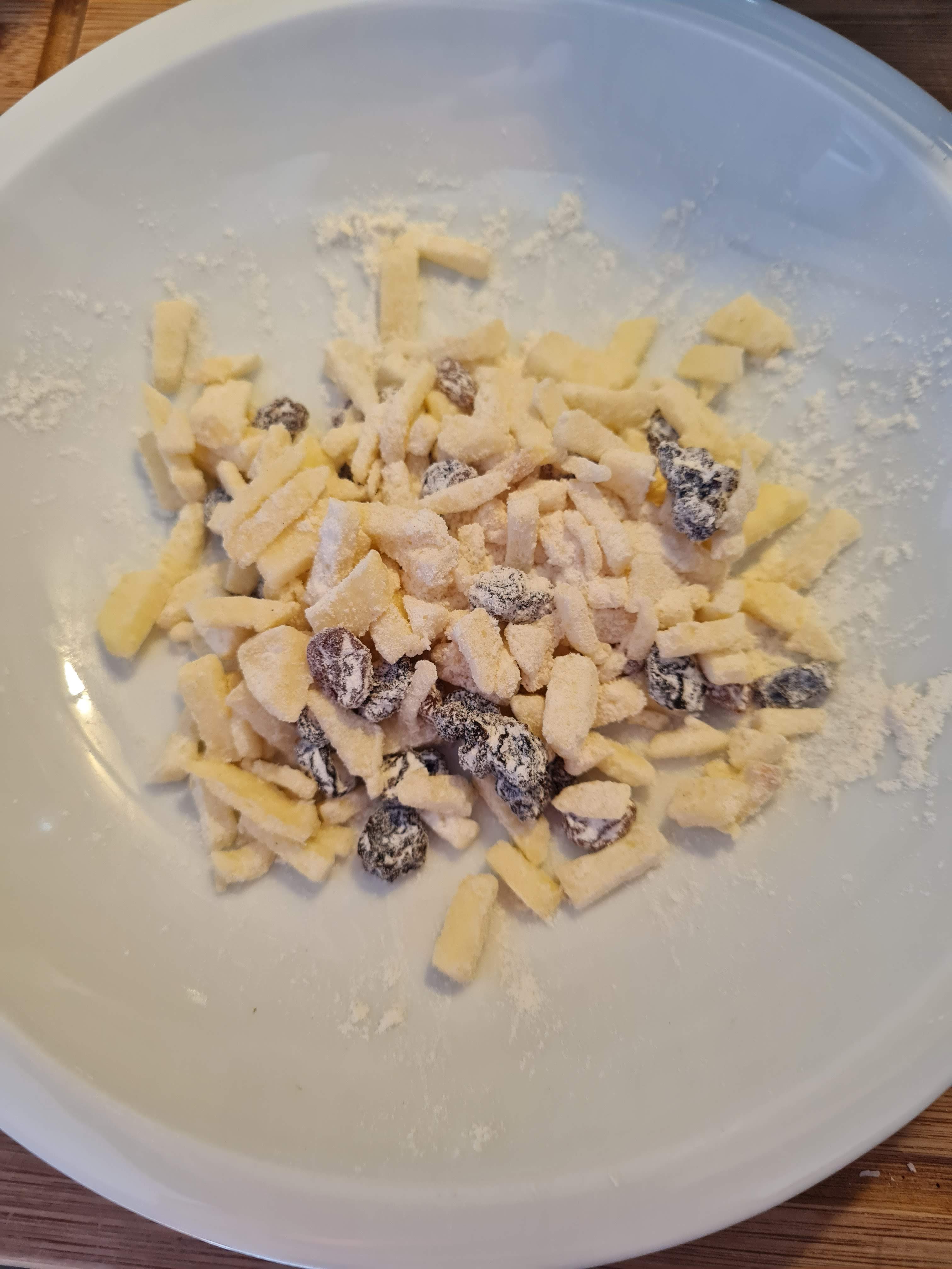 - Ябълковите кубчета и стафидите смесвам с 1 с. л. от брашното.