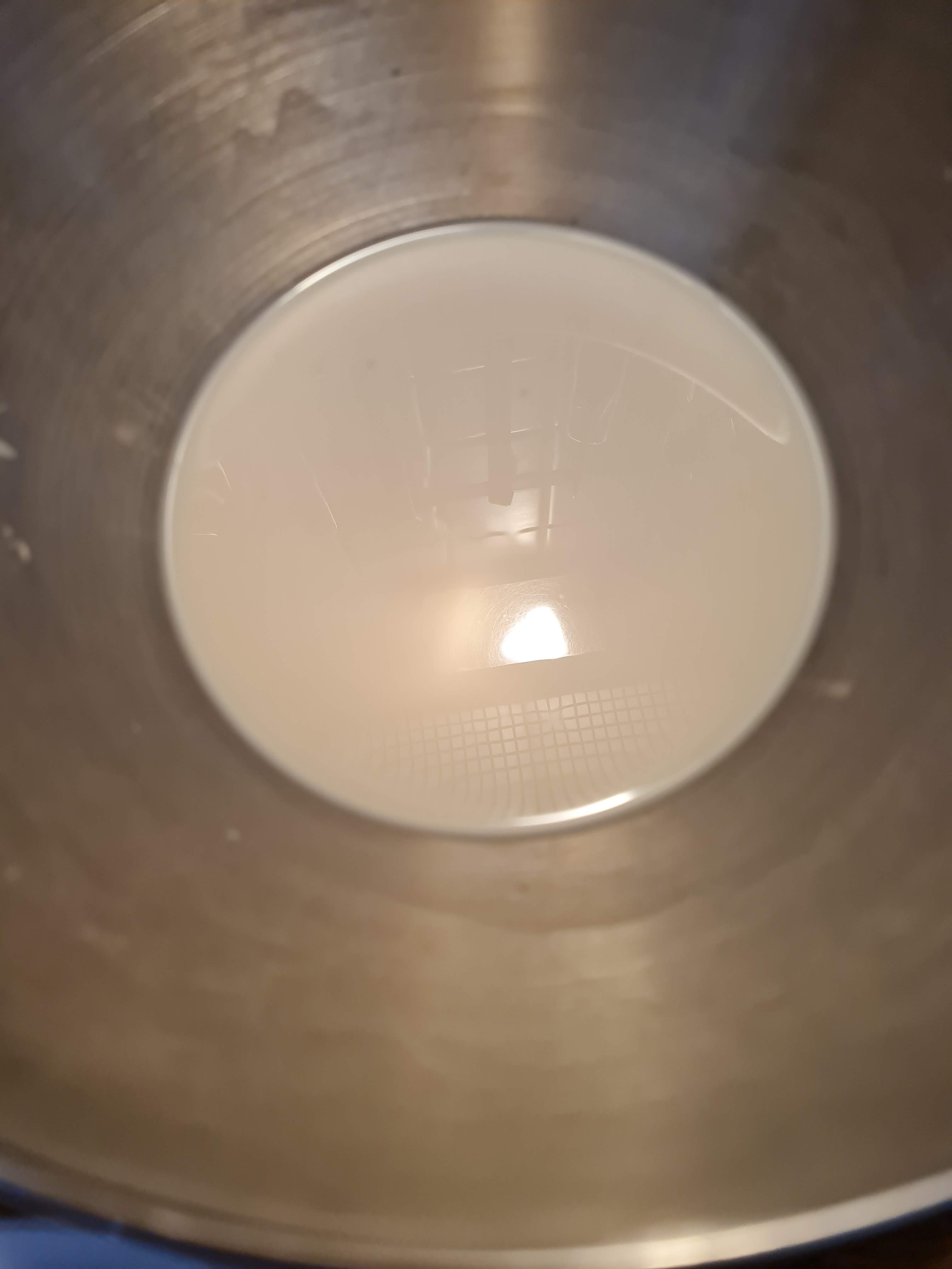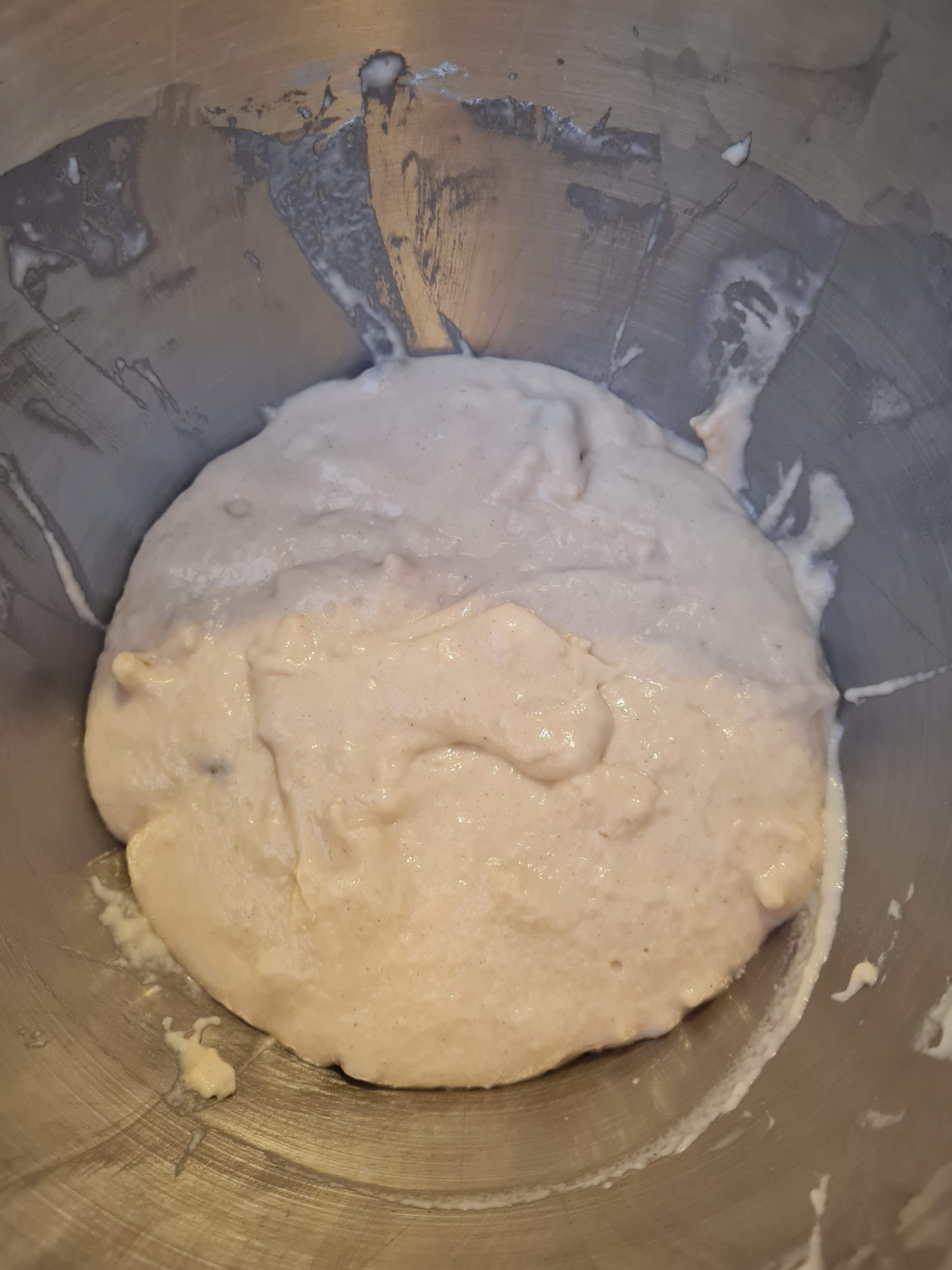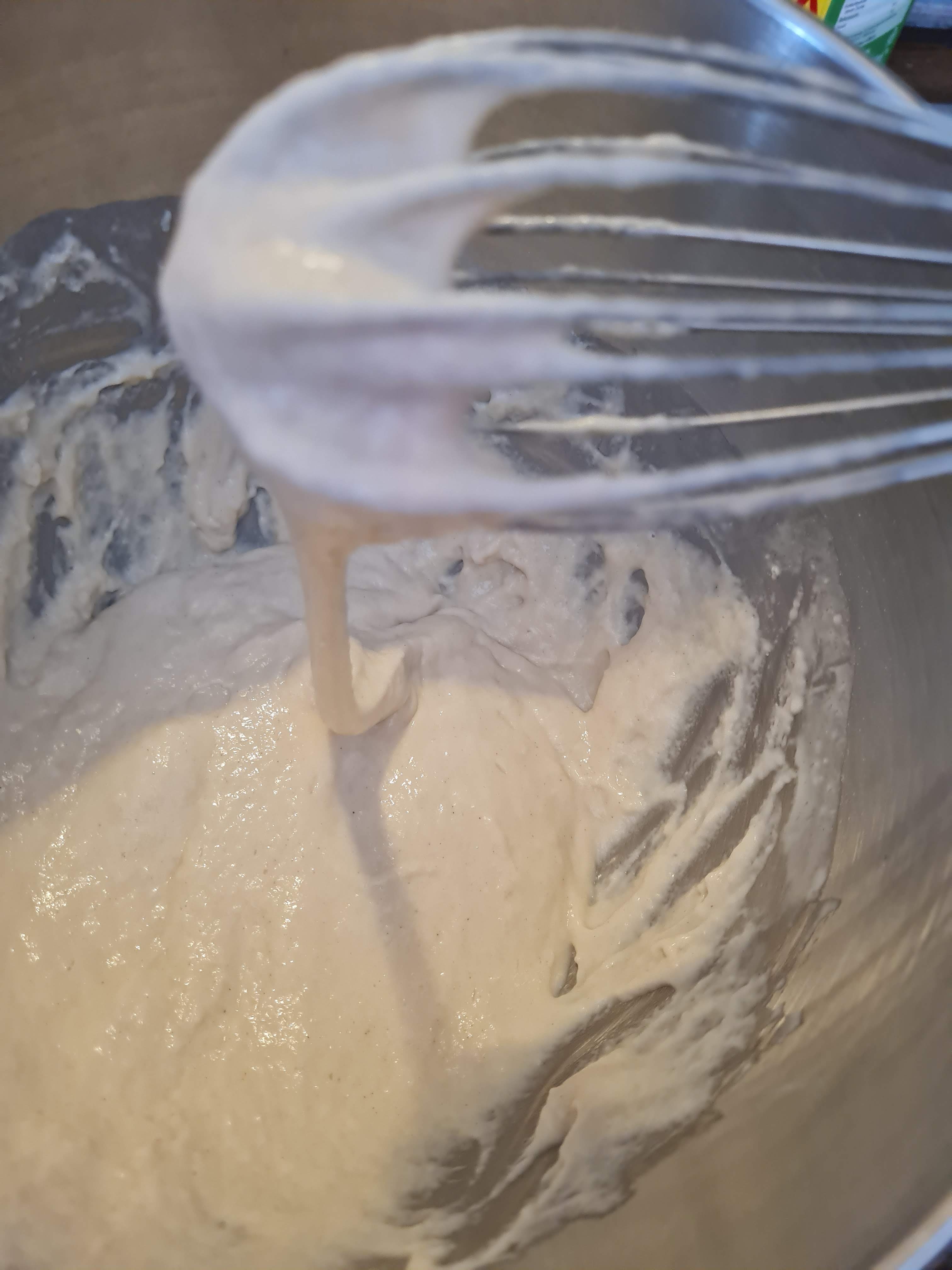 - Разбърквам всичко до гладко тесто с тел за разбиване.
