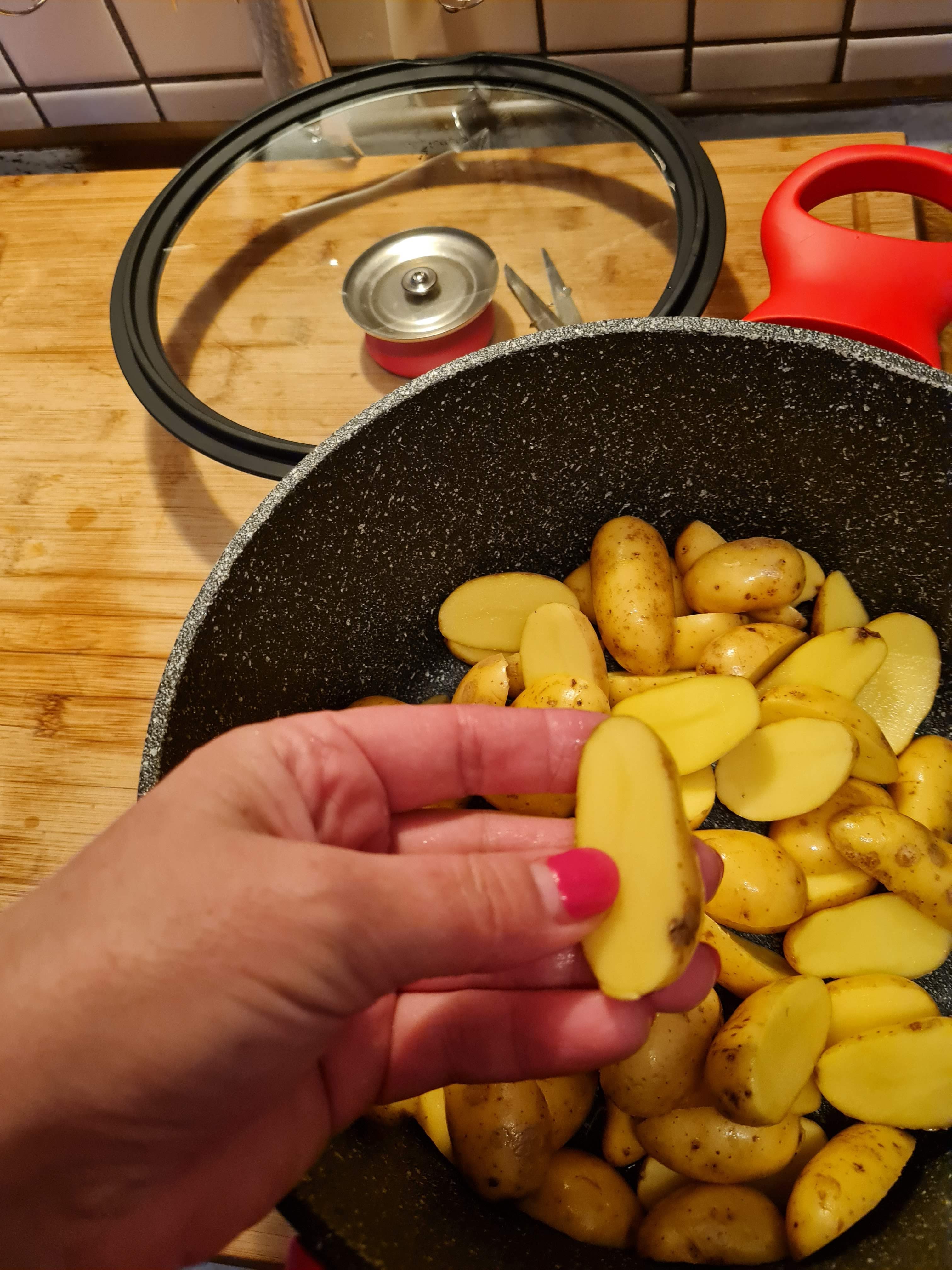 - След завирането на водата, засичам 6 минути. Време достатъчно за да са полу-готовви пресните картофки.