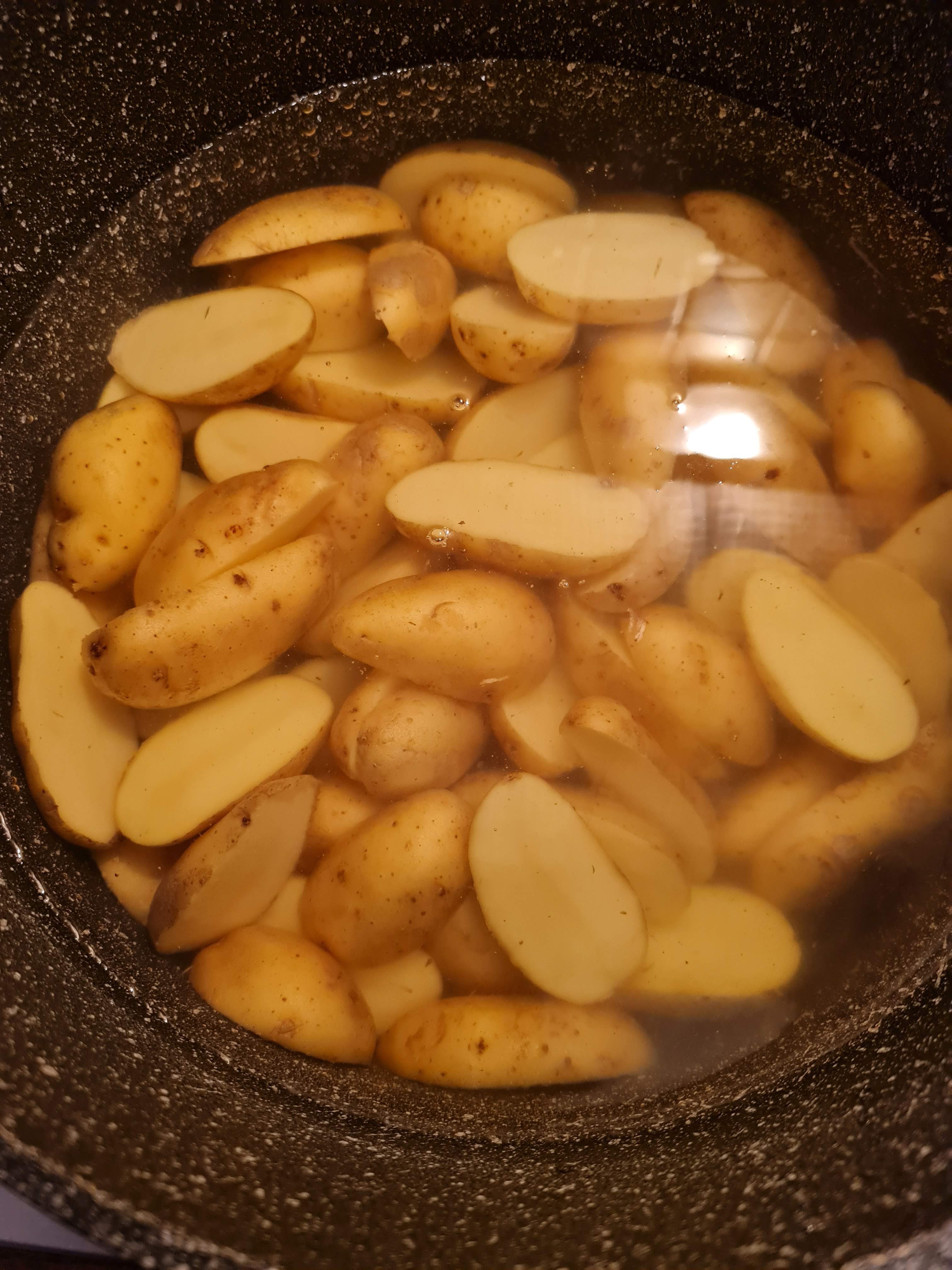 - Слагам в подходяща тенджера, добавям 2 ч. л. сол и заливам обилно със студена вода. Или поне около 4 пръста над картофките.