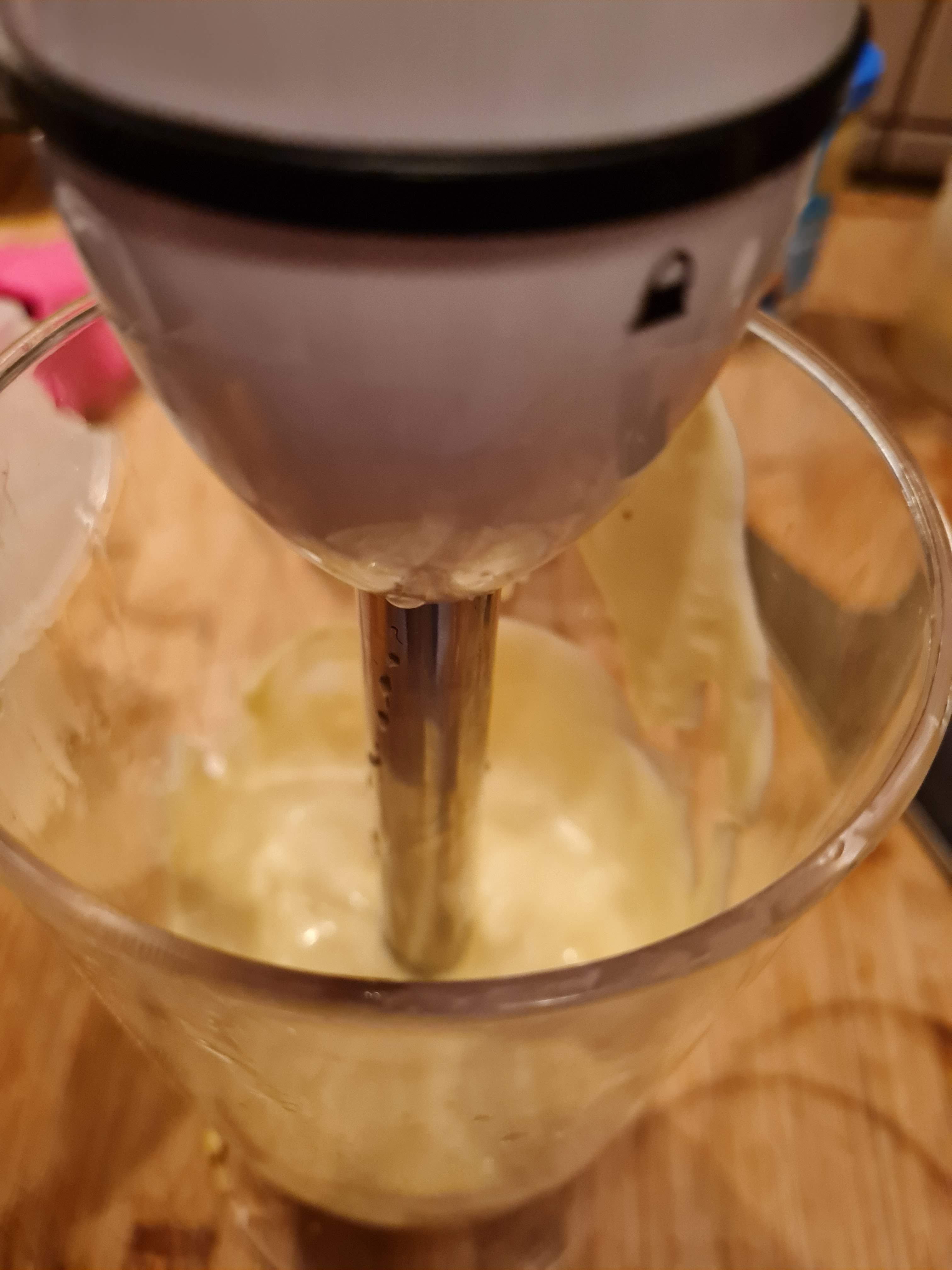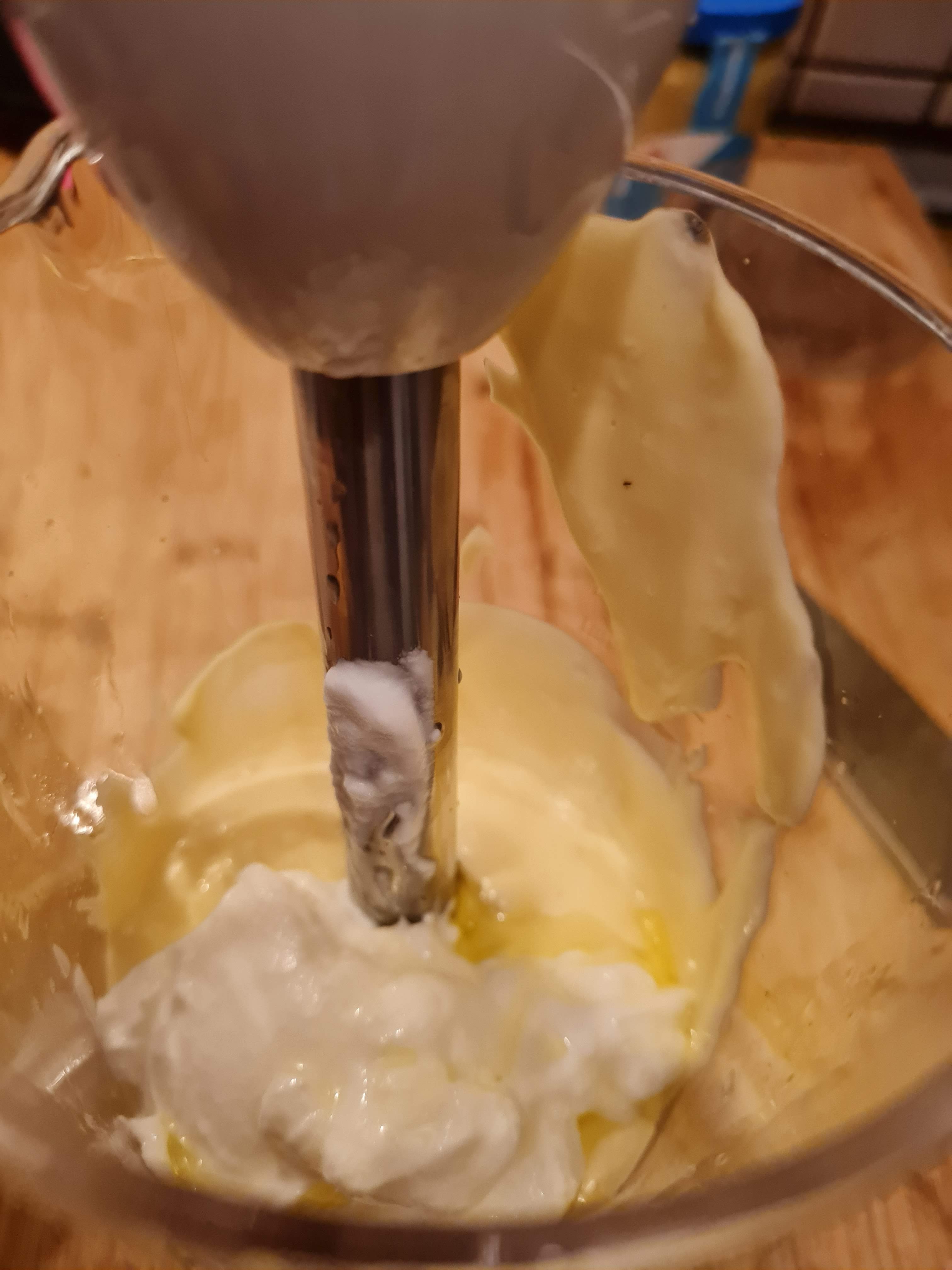 - После пресипвам всичко в чашата на пасатора и продължавам с него като добавям олиото на 6 – 7 пъти или до получаването на пухкава майонеза. Ако не сте приготвяли майонеза до сега можете да прочете подробности ето тук.