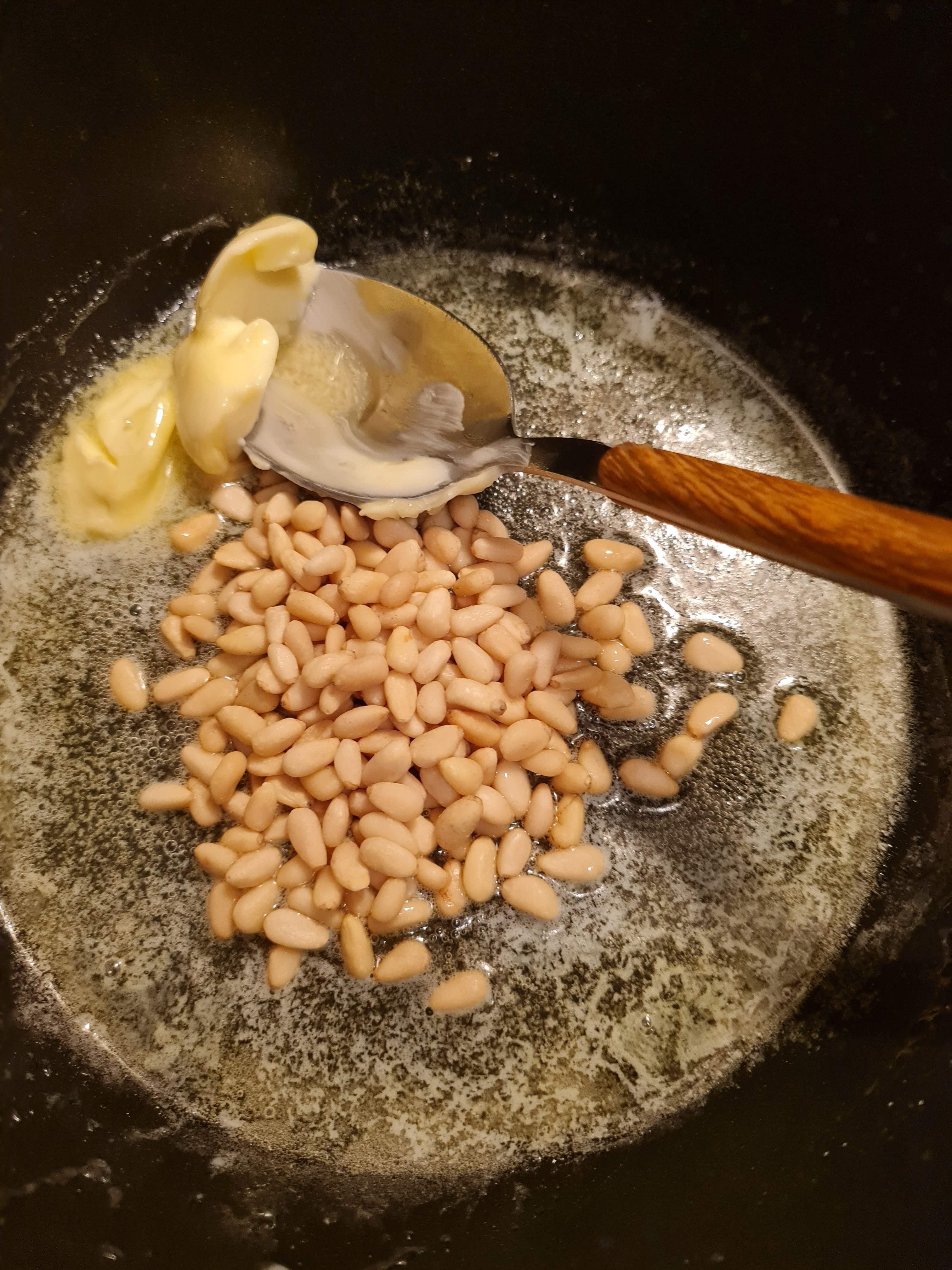 - За маслото с кедрови ядки загрявам първо самото масло, после запържвам в него и до златисто кедровите ядки. Добавям опушения червен пипер, разбърквам и изключвам котлона. Важното е само да замирише на опушен червен пипер, но не и да се запържва.