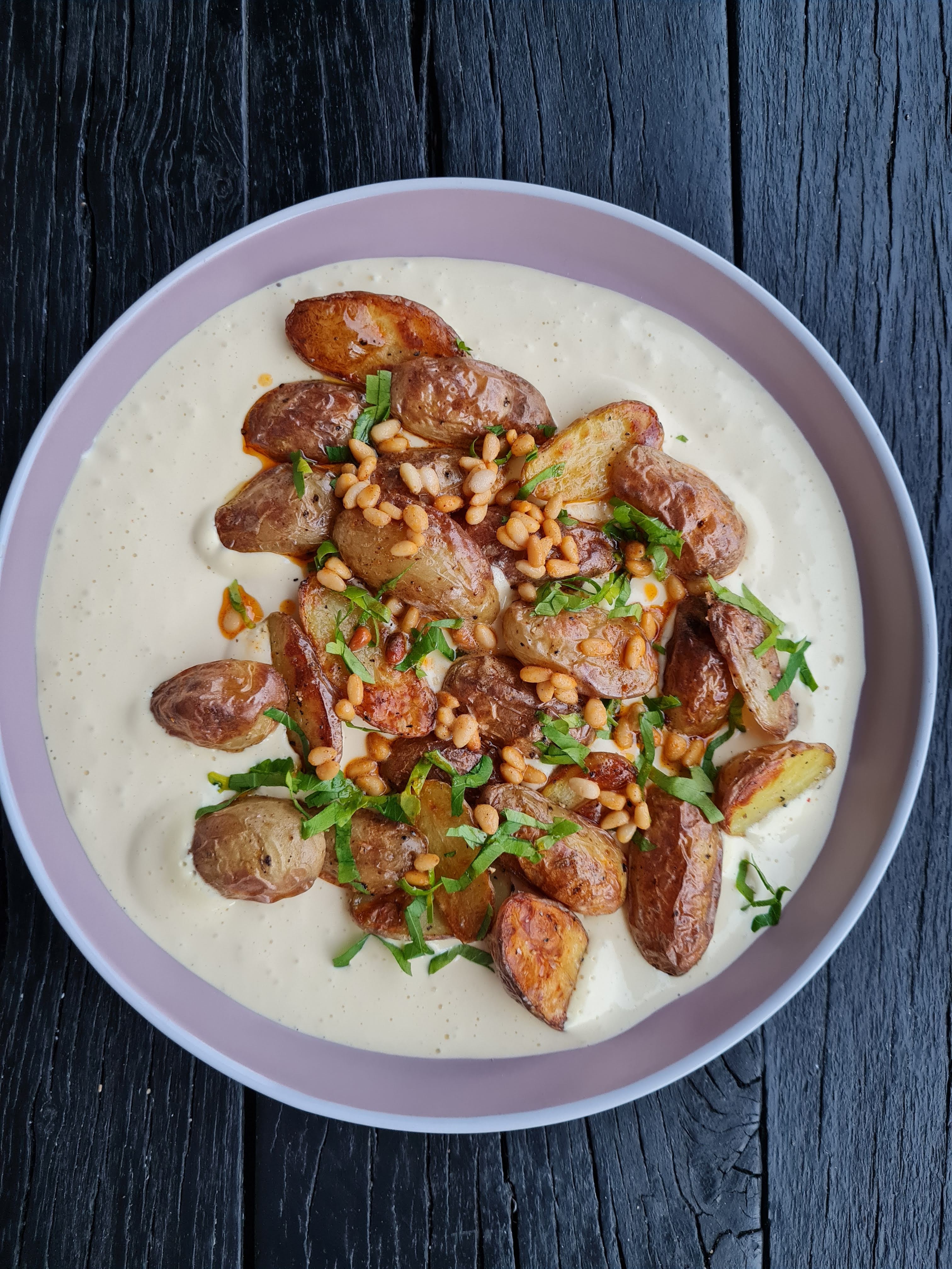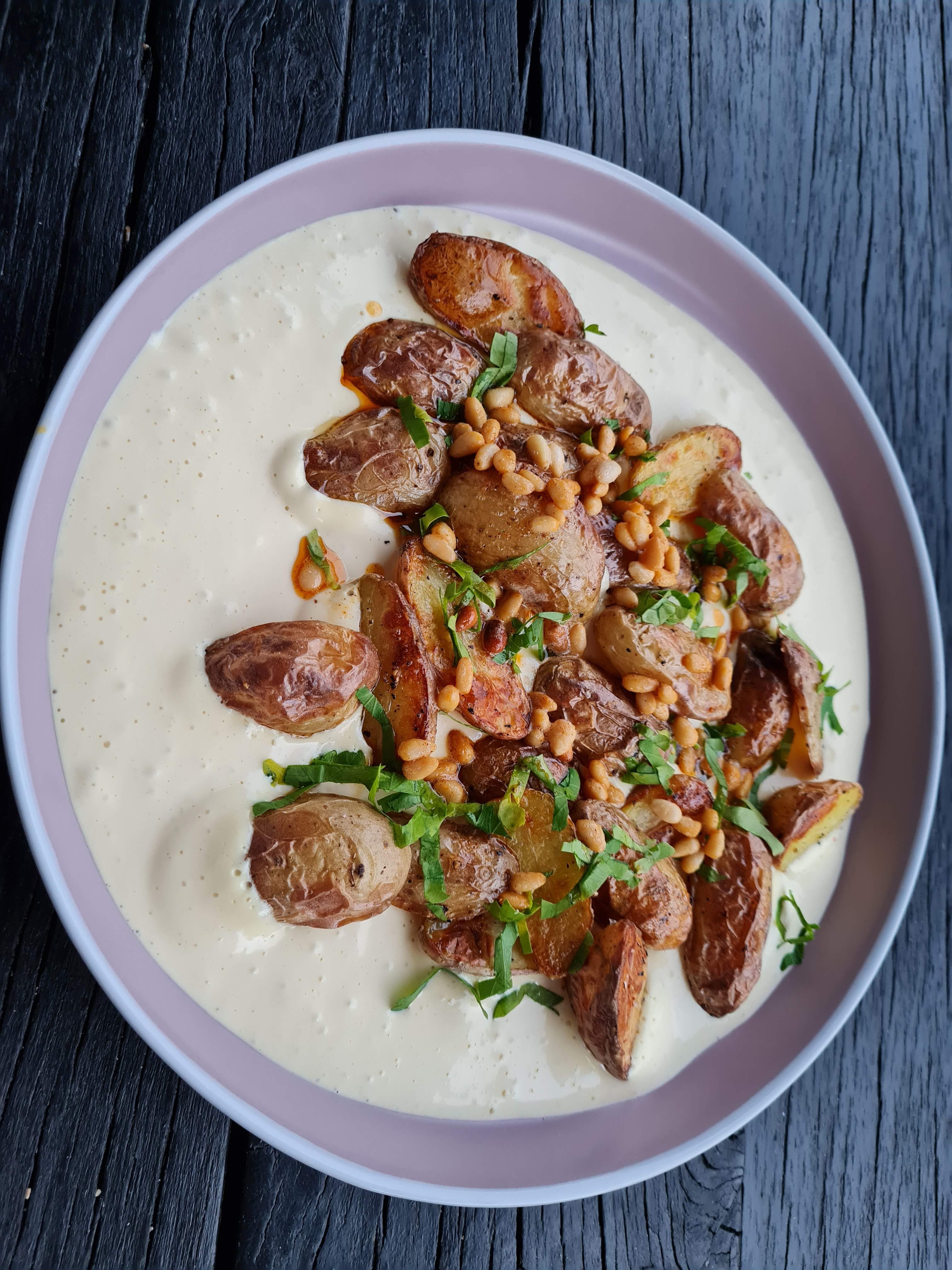 - В чинията за сервиране изсипвам първо айоли соса. Върху него подреждам картофките и най-накрая изсипвам кедровите ядки с маслото.