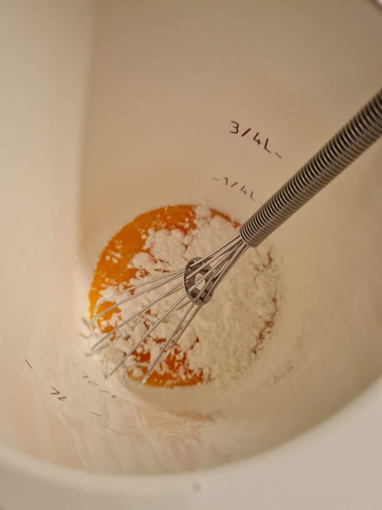 - За целта смесвам в купа жълтъка, нишестето и разбивам с тел.