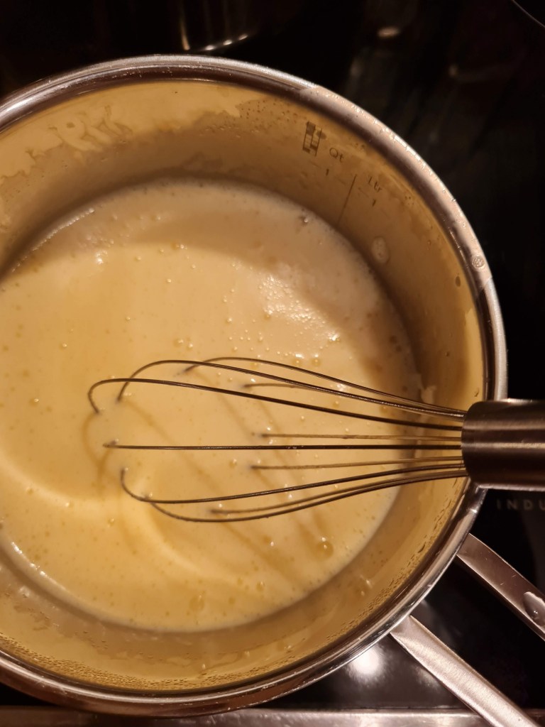- Горещата млечна смес добавям на тънка струя към яйчената смес като не спирам да разбивам.