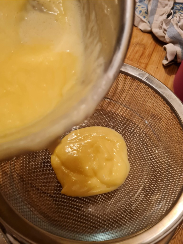 - Готовия пудинг минавам първо през сито и после покривам с фолио за свежо съхранение, за да не хваща кора.