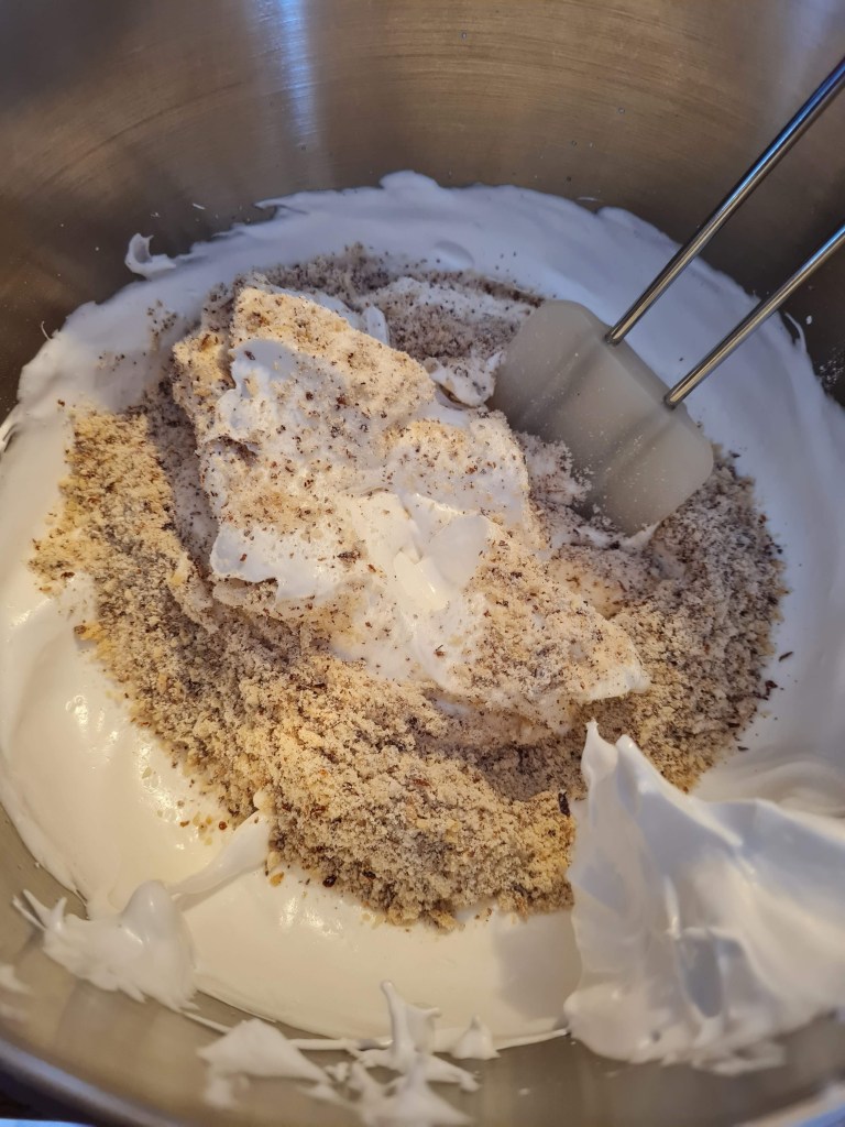 - За блатовете първо си смесвам сухите съставки в купа – смлените лешници и брашното.