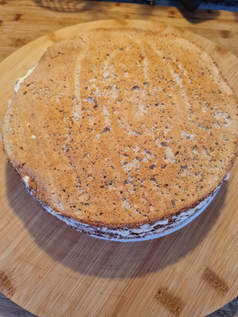 - Последния блат слагам, но обърнат с дъното към мен, за да е равна повърхността на тортата.