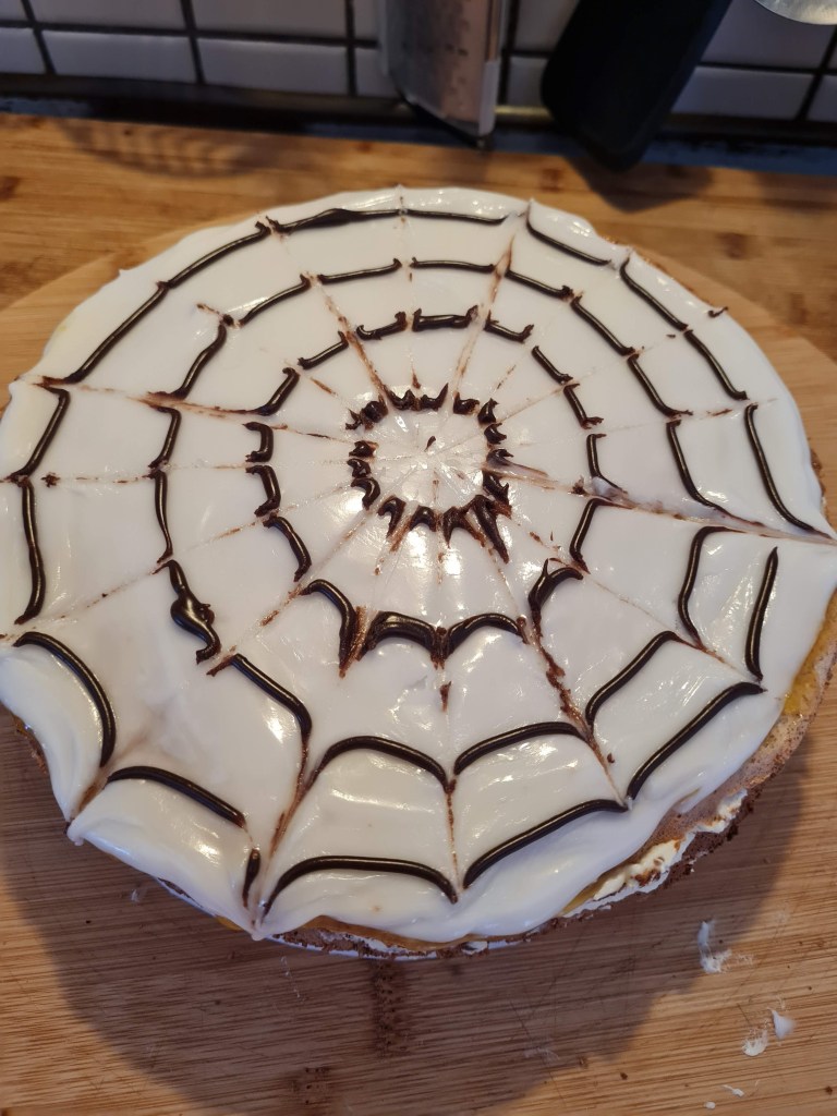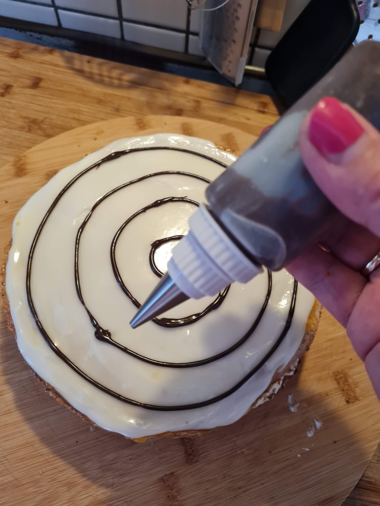 Декорацията на тази торта се прави с течен фондан (често заменян със захарна глазура) и оцветен с какао течен фондан (често заменян с шоколад).