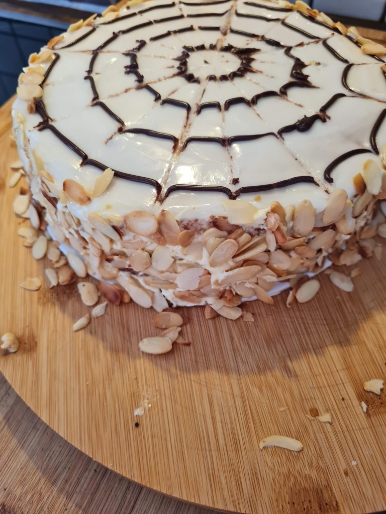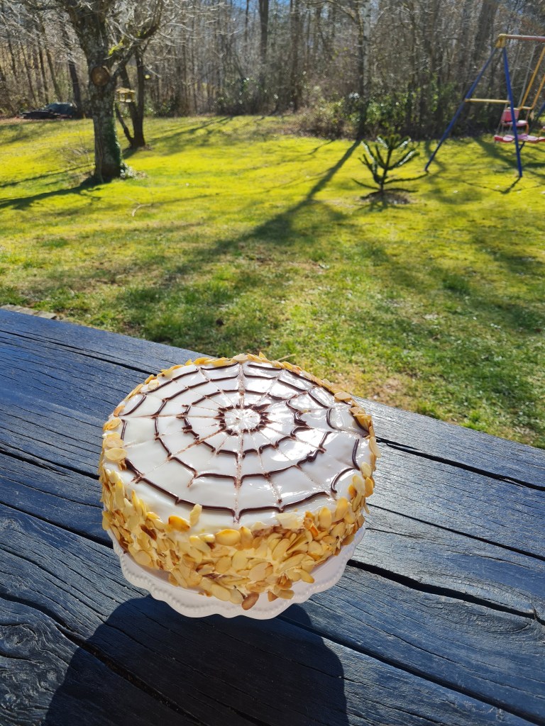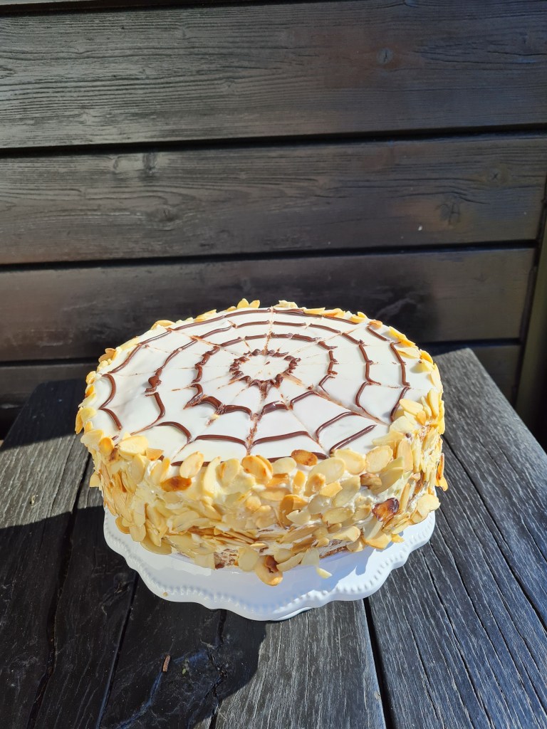 - Измазвам тортата отстрани с останалия крем, запичам бадемите в сух тиган и залепям върху крема и отстрани на тортата.