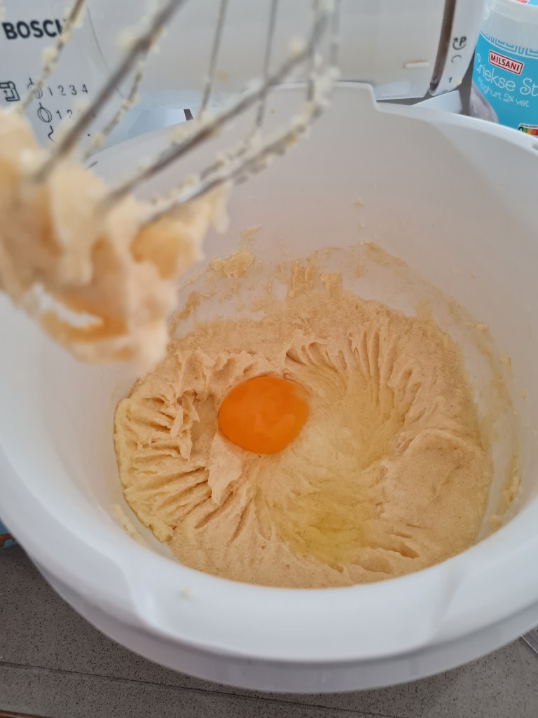 В купата на миксера смесвам маслото и захарта. Разбивам и после добавям едно по едно яйцата.