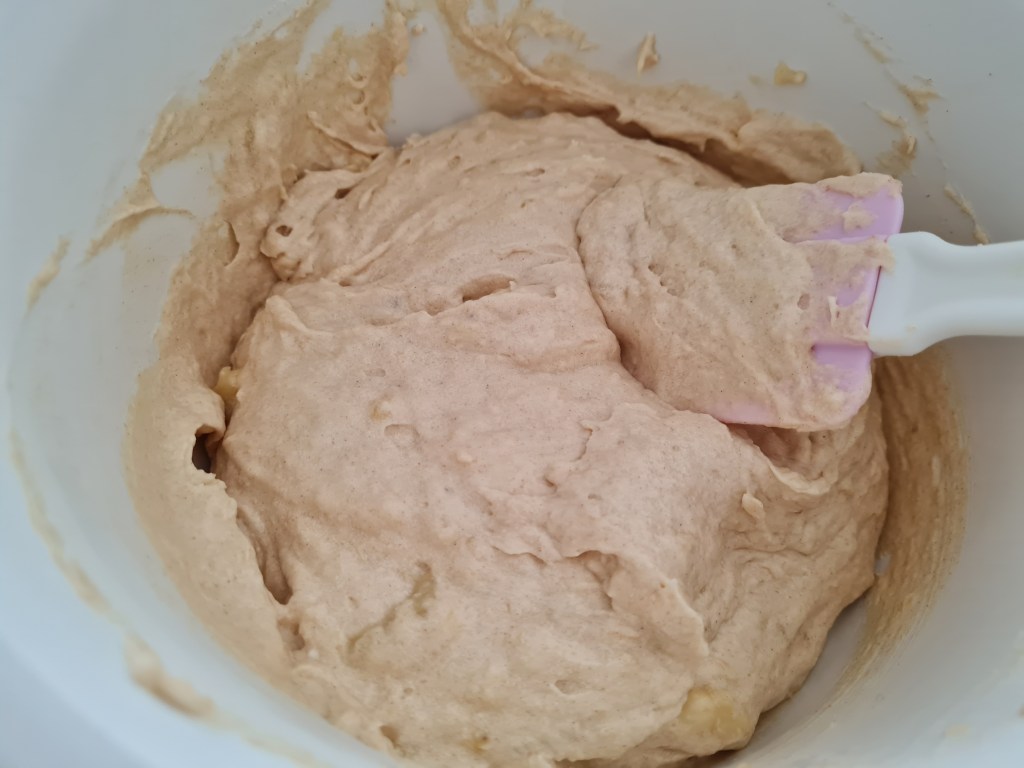 Най-накрая към тестото добавям крем фреш и банановото пюре, като вече не препоръчвам миксер.