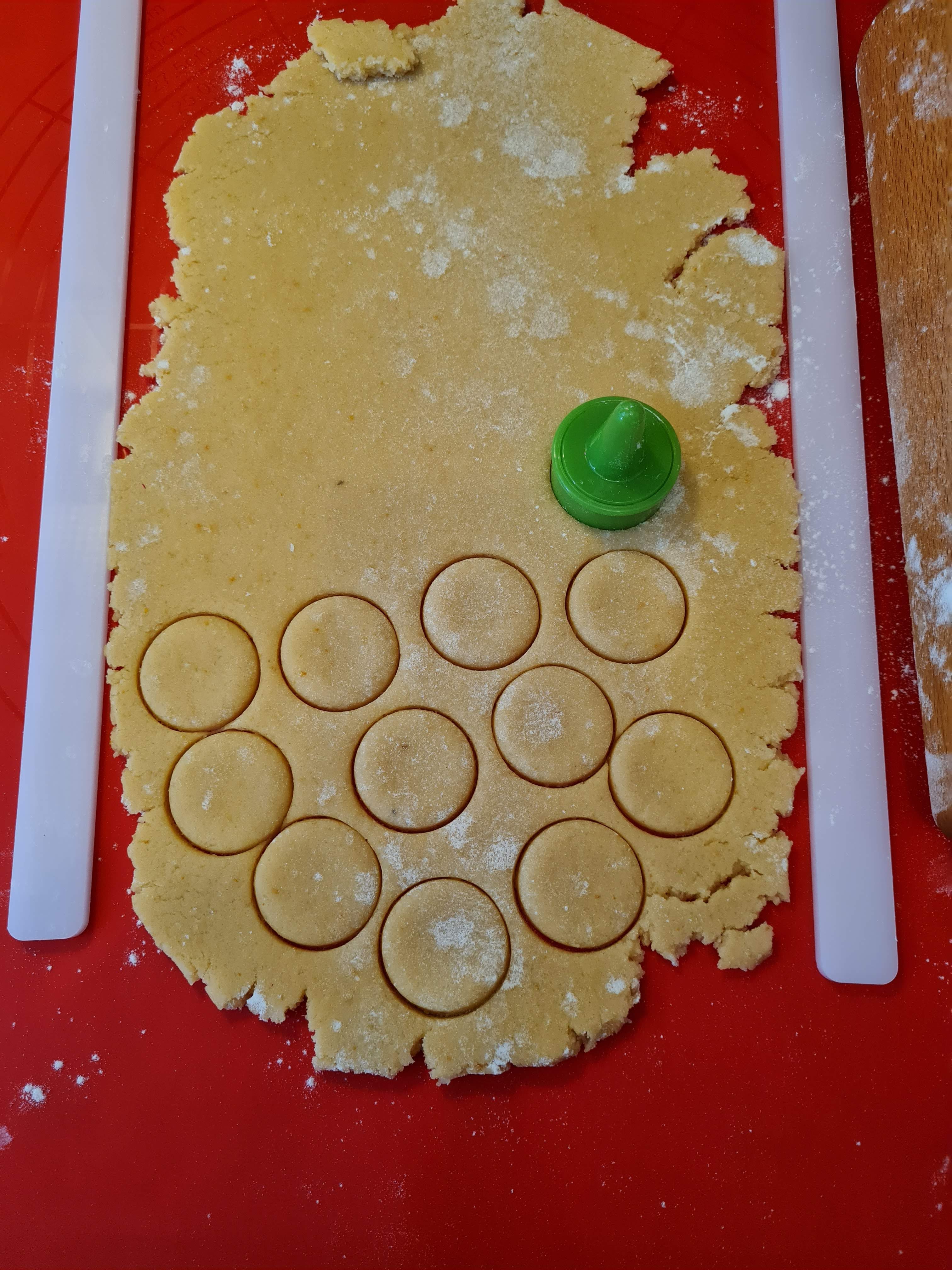 Един ден, преди да направя сладките си изпичам бисквитките, които са основата им и са с диаметър около 3 – 4 см в диаметър. Изрязват се с добавената за целта формичка.