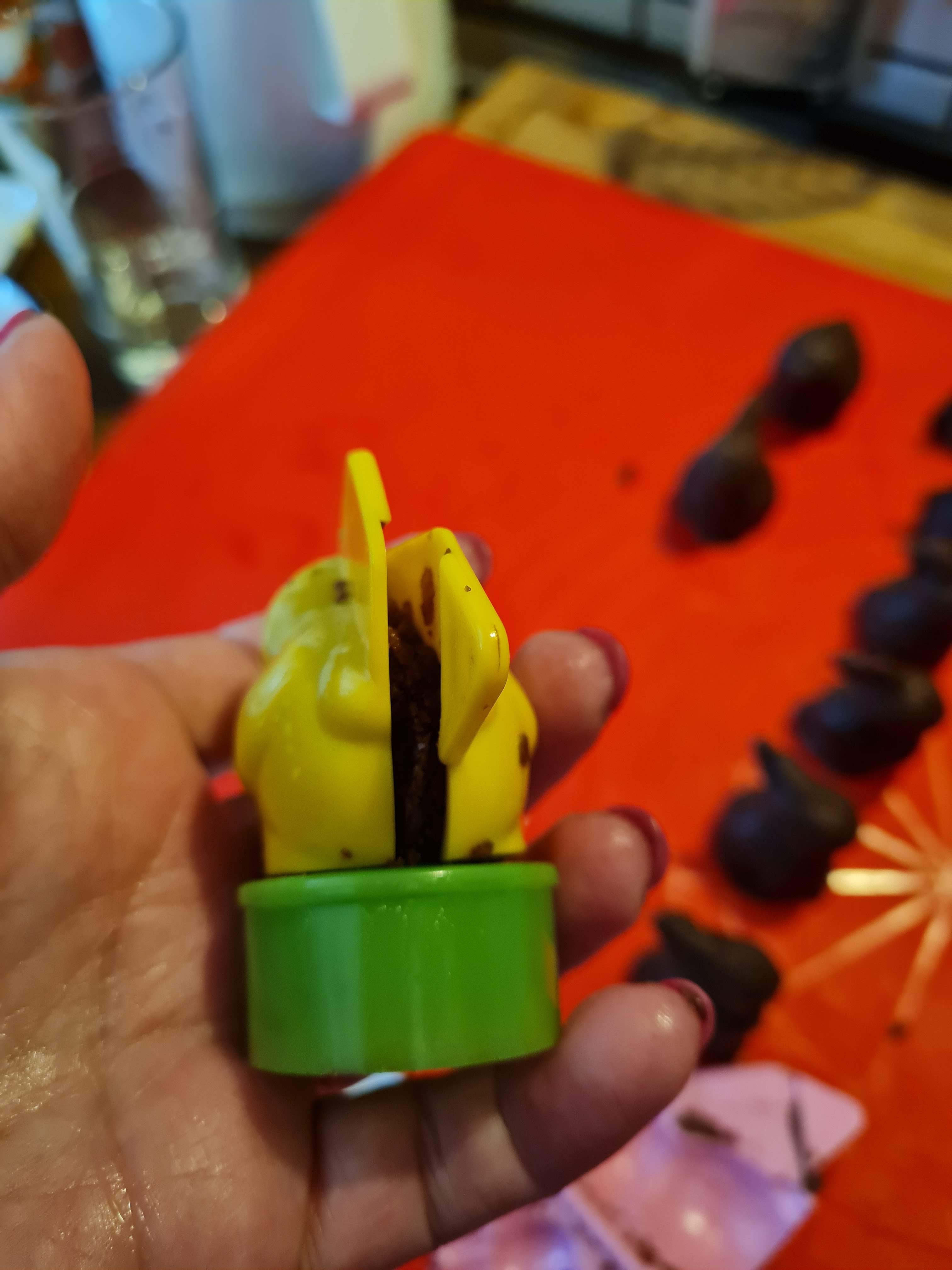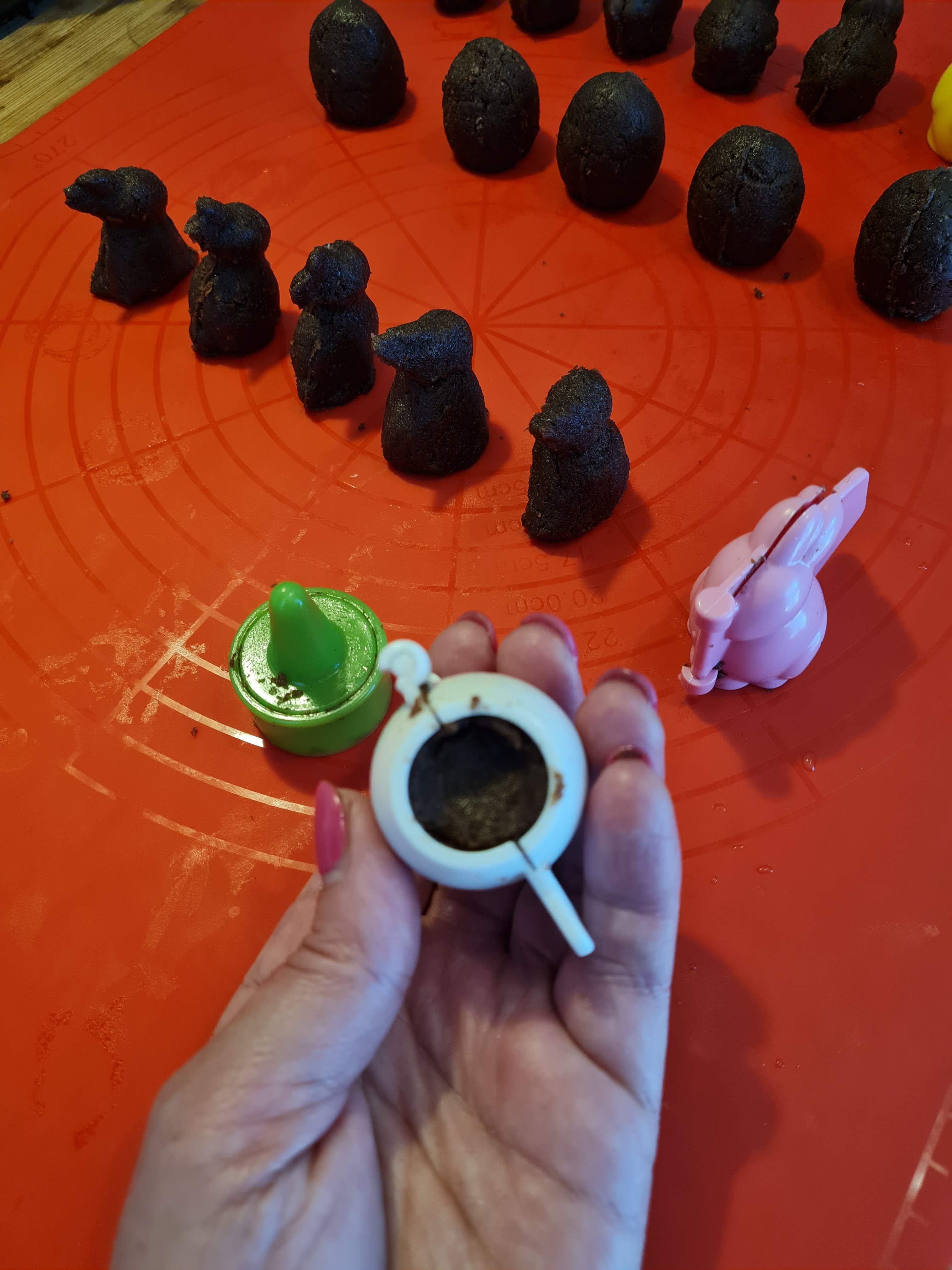 Късам от тестото и оформям топка малко по-голяма от орех, която напъхвам в избраната от мен формичка. Притискам добре с пръст, за да може тестото да достигне до всички детайли на фигурката. Например до ушите на зайчето.