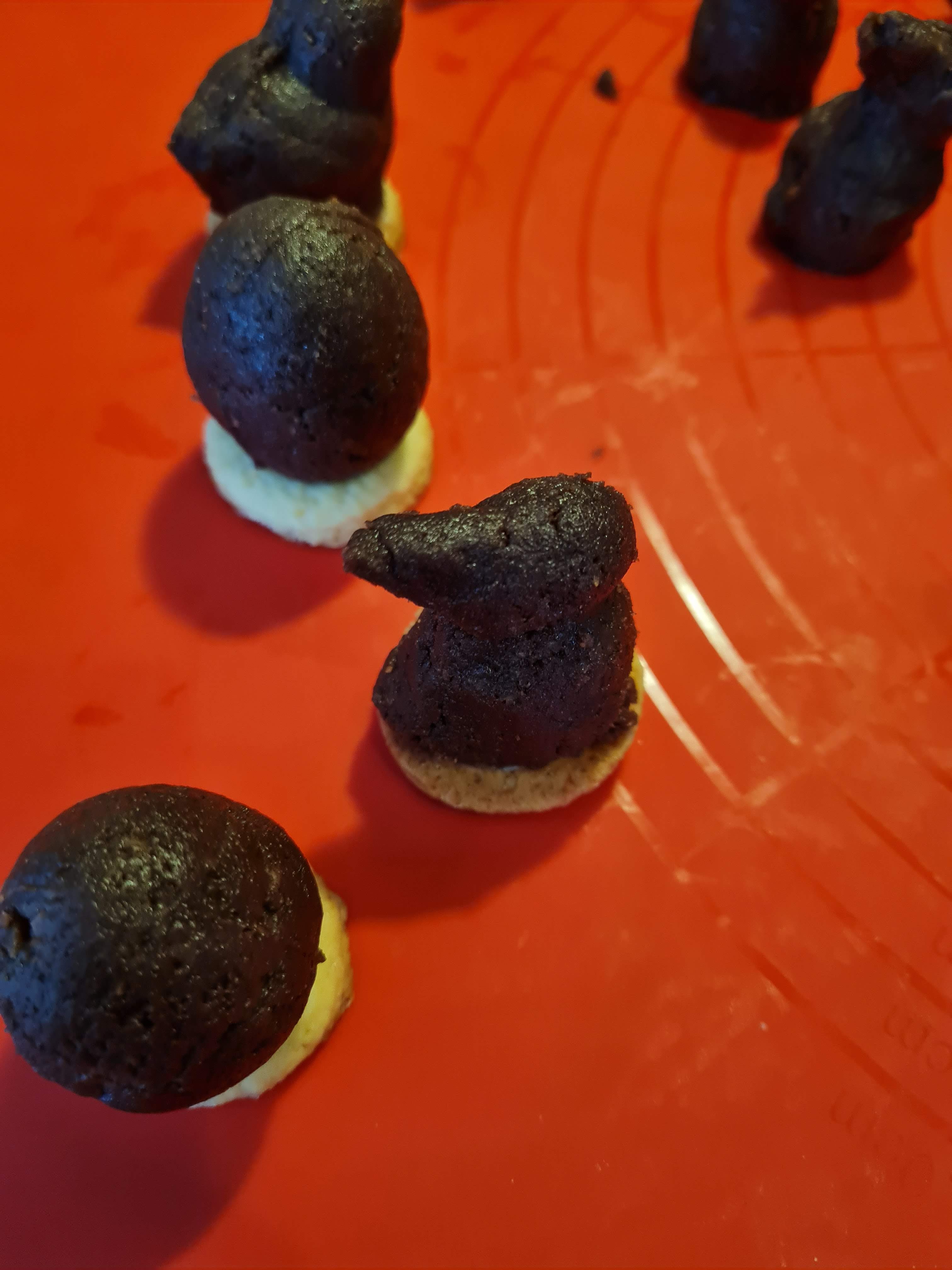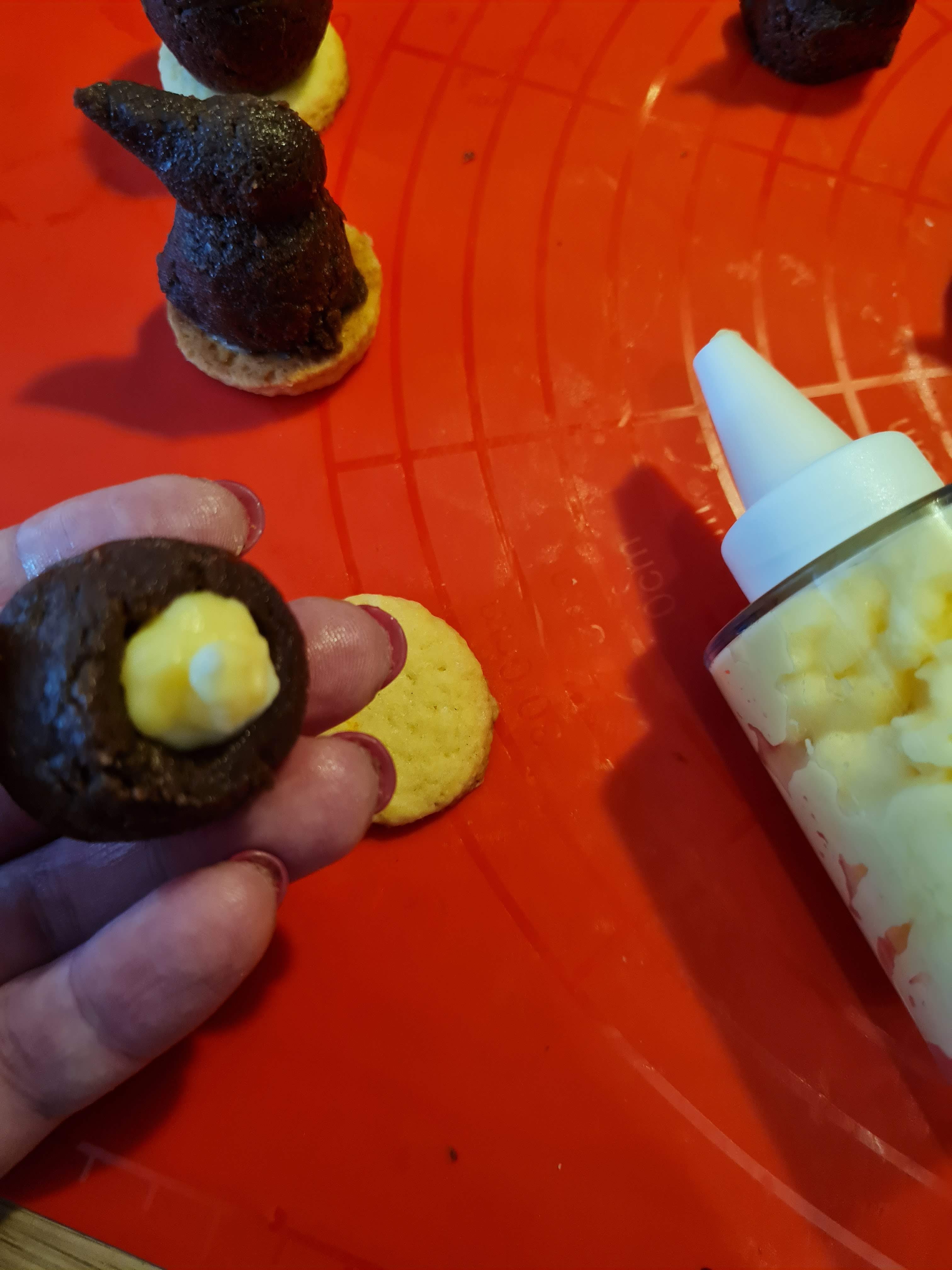 Пълната с крем сладка веднага обръщам върху една бисквитка, за да може излезналия крем да залепи фигурката и като стегне да стане стабилна.
