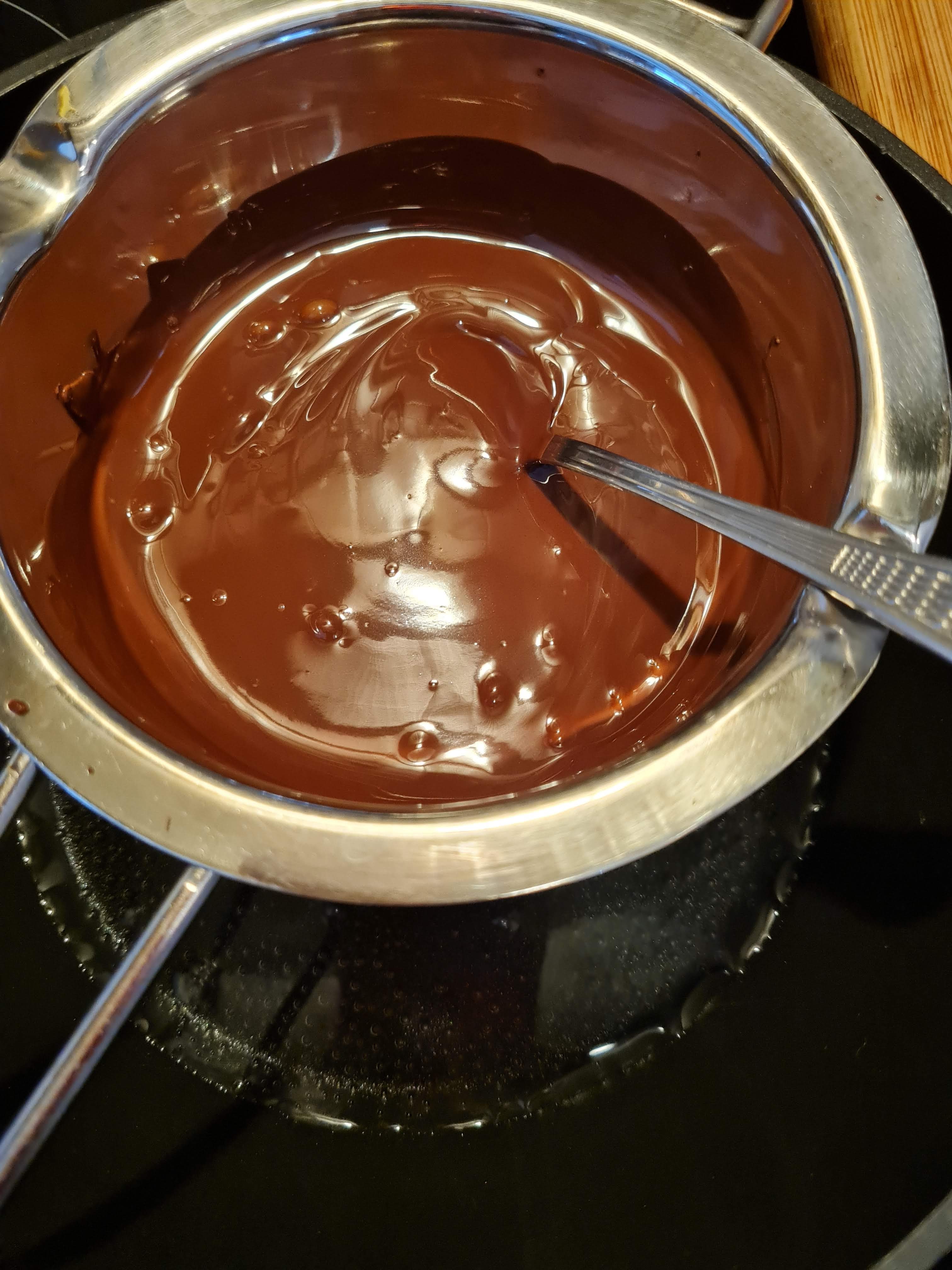 Слад като са готови всички фигурки и тестото е свършило, разтопявам кувертюра на водна баня.