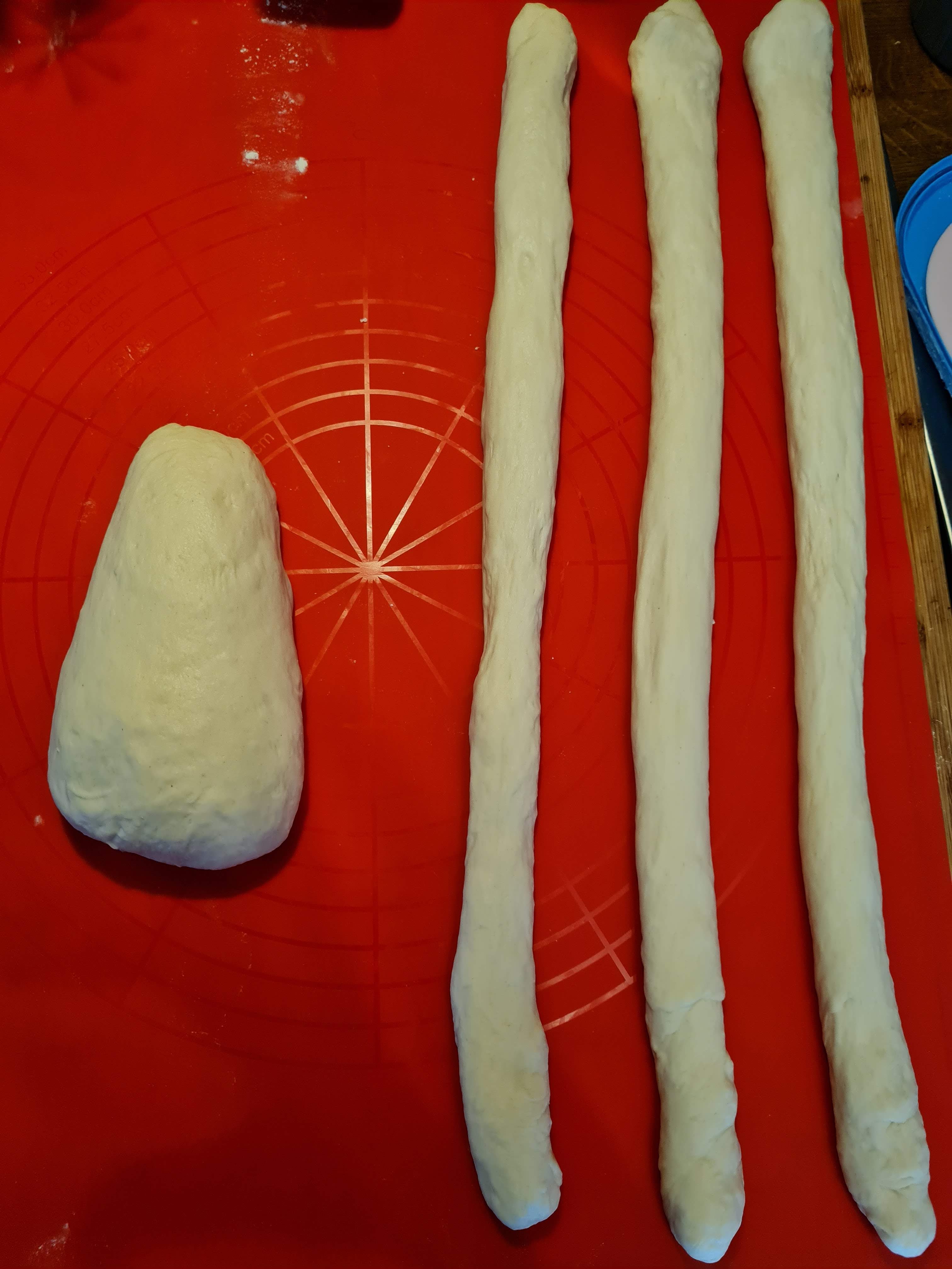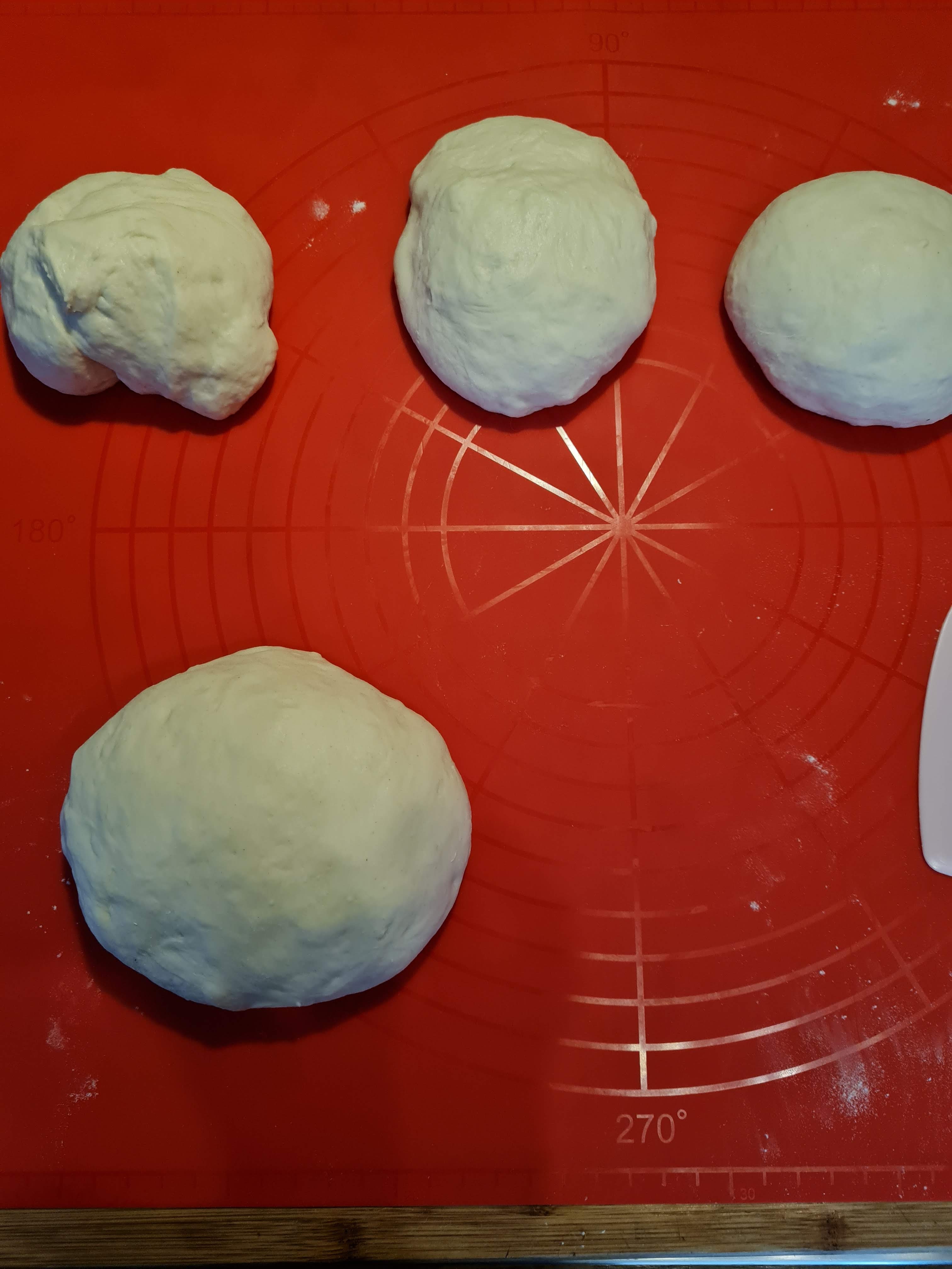 От втасалото тесто си отделям три топки по около 200 г и една по-голяма около 300 г.