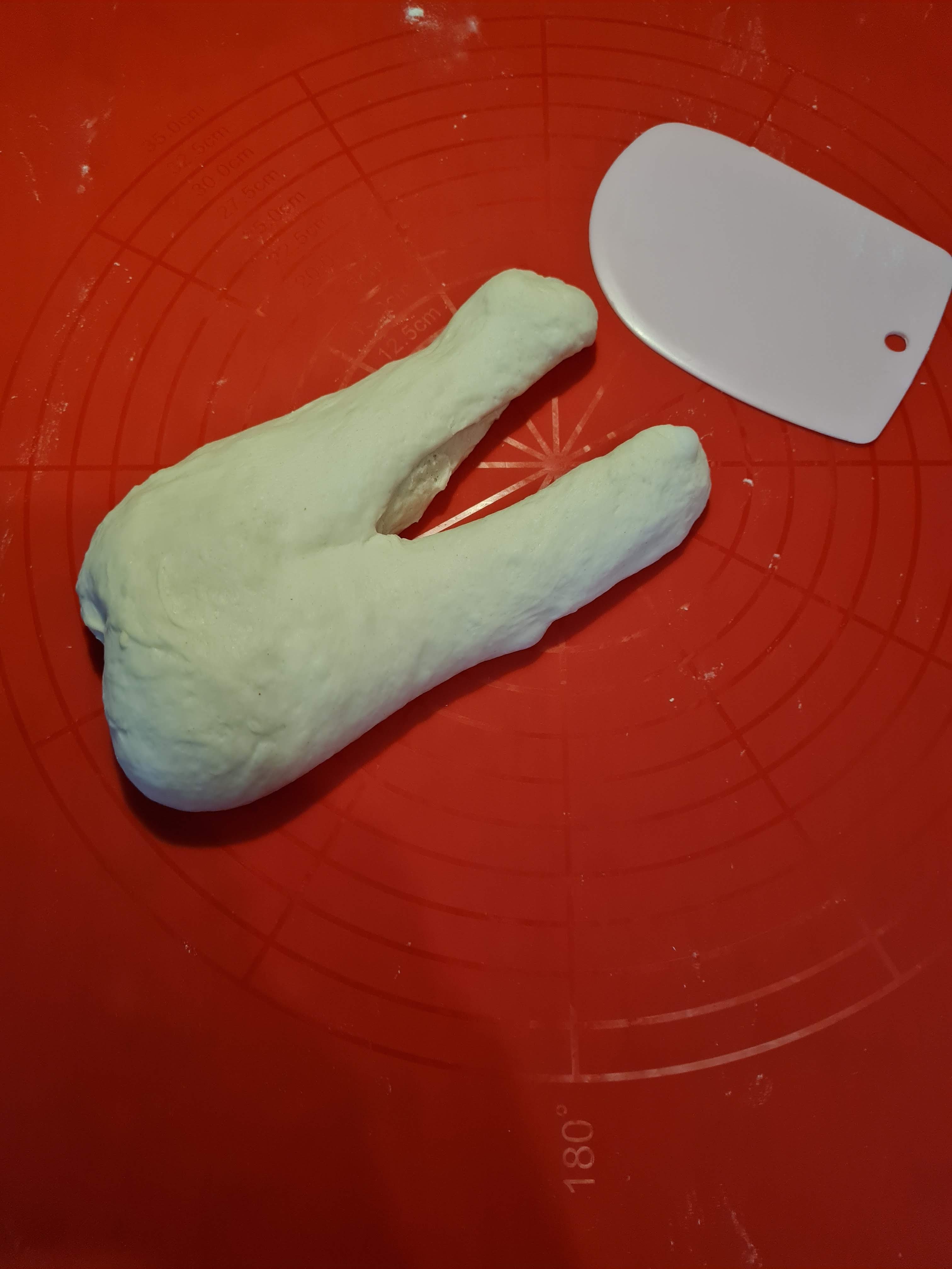 Конусовидното тесто разделям в горната част или 2/3 от него така, че да получа главата и ушите на зайчето.