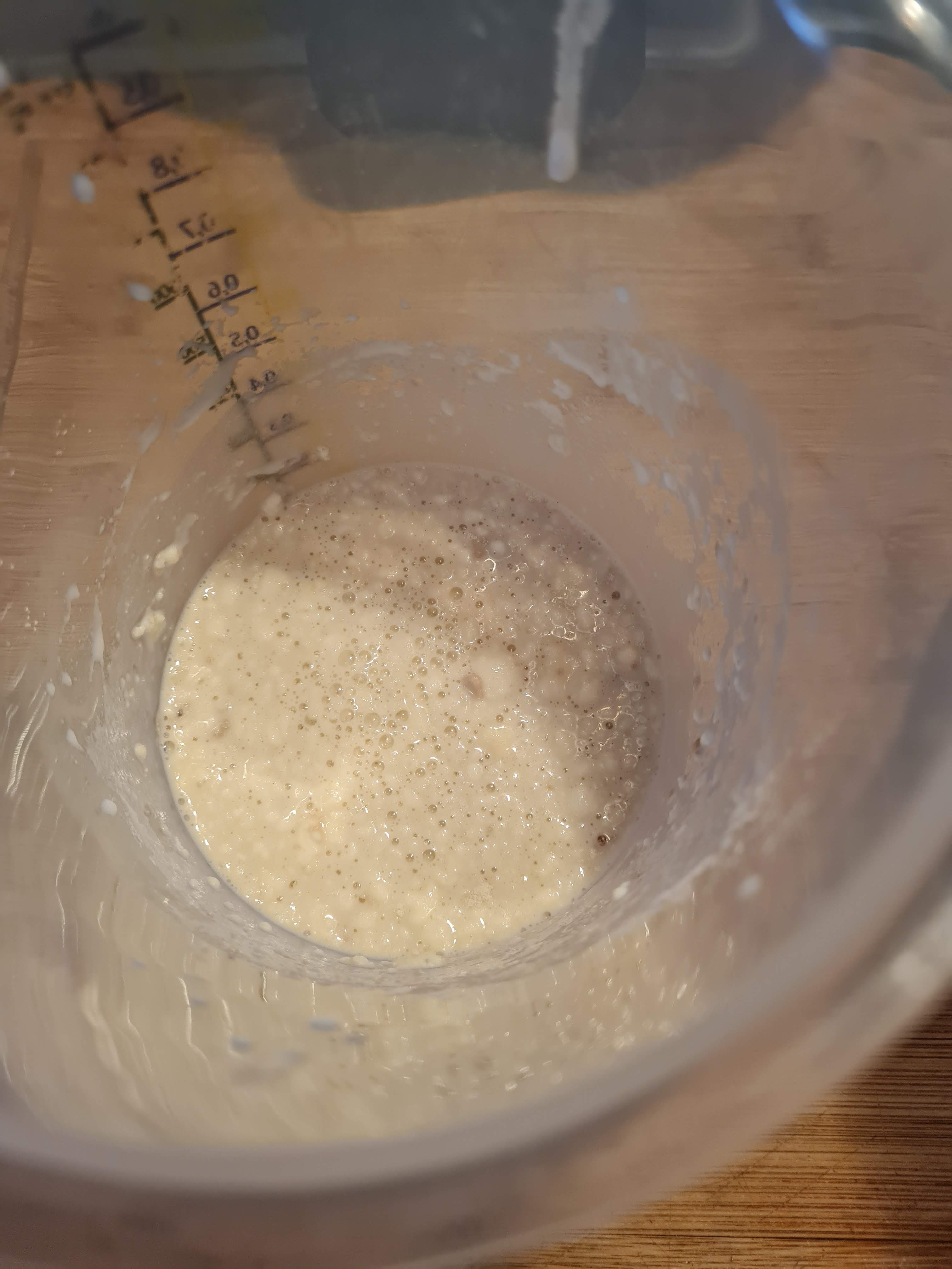 Започвам с активирането на маята нищо, че е суха. За целта загрявам 1/3 от прясното мляко до около 25 градуса, сипвам пакетчето мая, 1 ч. л. от захарта и 2 с. л. от брашното. Получавам кашичка, която оставям на стайна температура за около 5 минути да шупне.