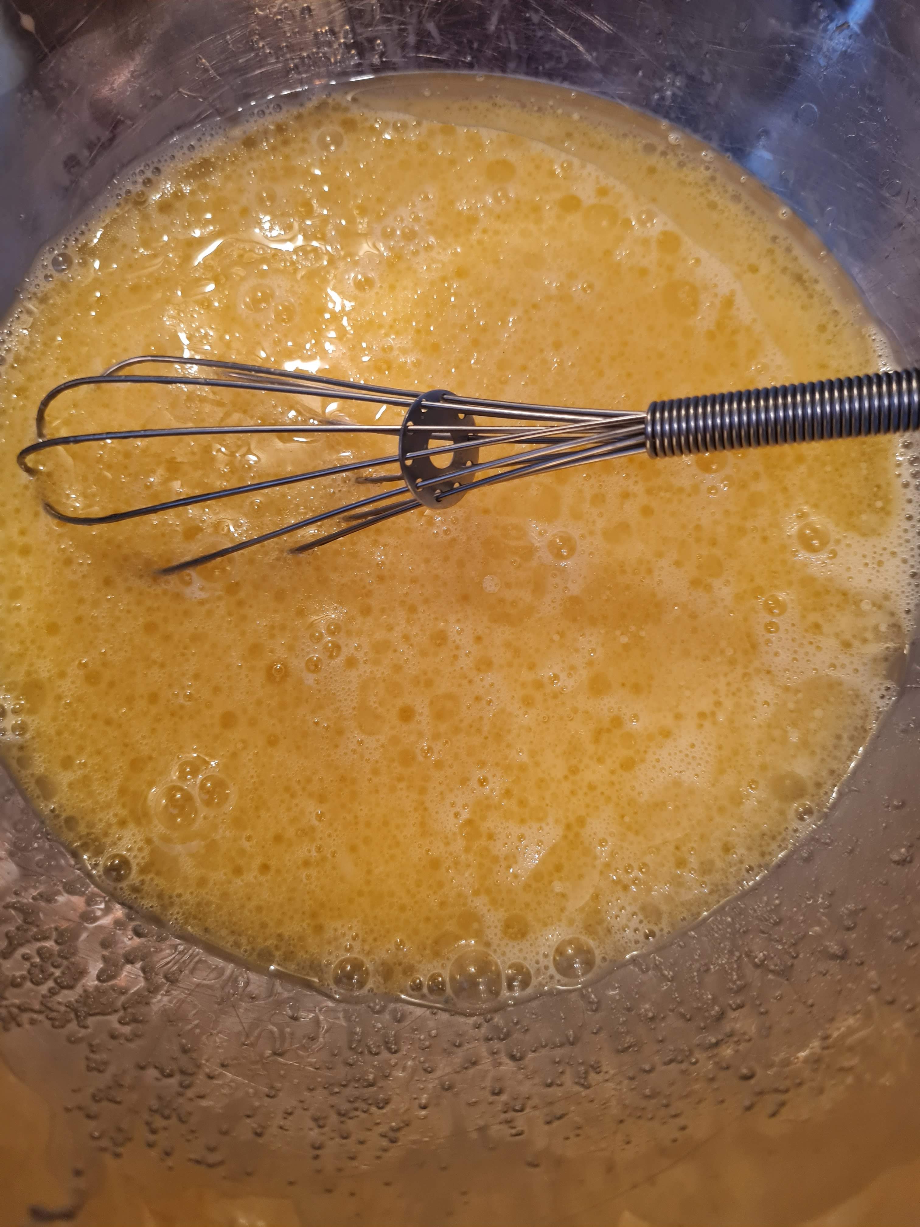 През това време и в друга купа смесвам яйцата, захарта, останалото и студено прясно мляко, алкохола, ванилията, лимоновата кора, щипка сол, 45 мл олио.