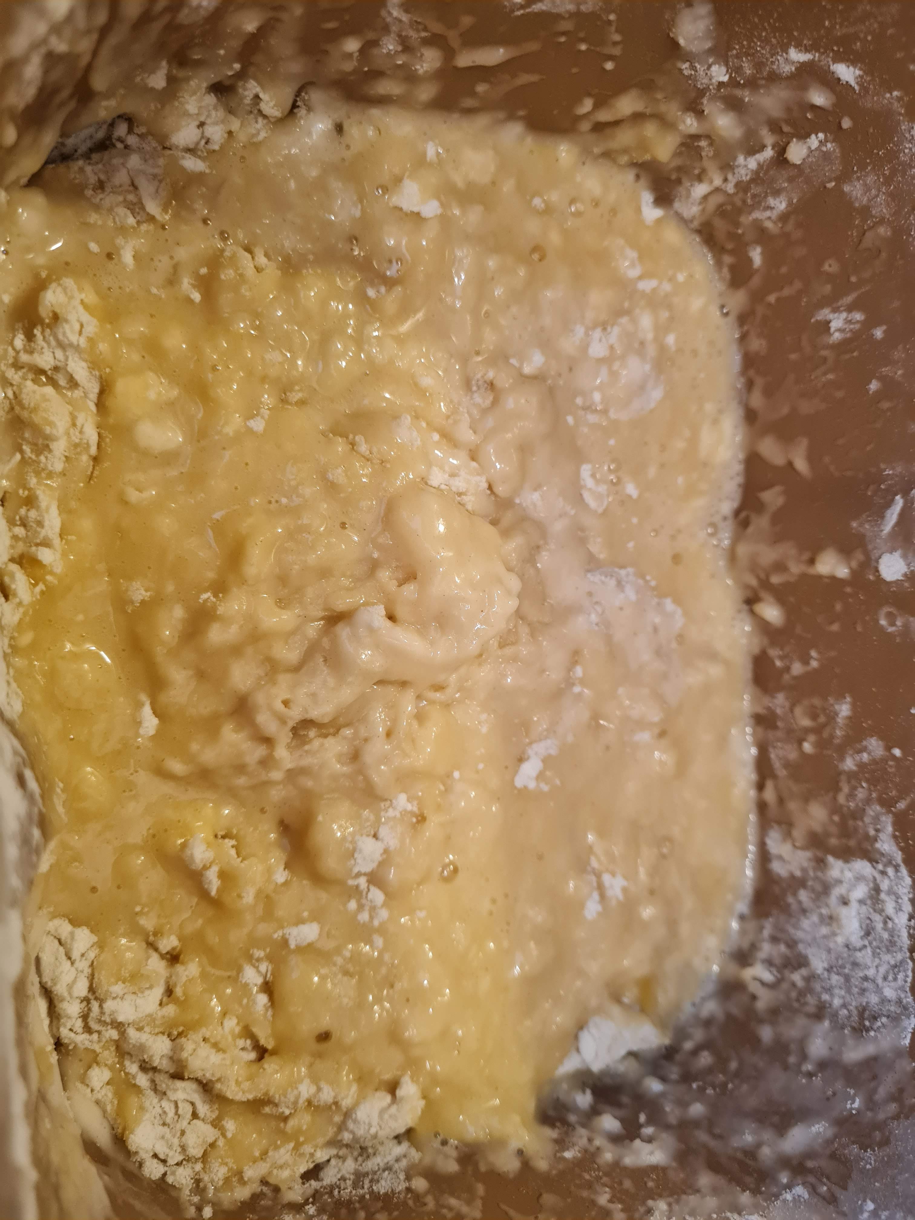 Разбивам с тел за разбиване и накрая добавям 450 г от брашното и шупналата мая. Грубо разбърквам и изсипвам във формата на пекарната.